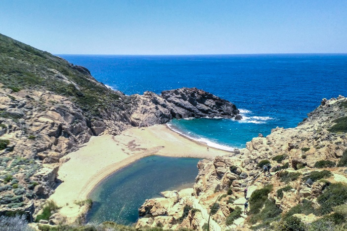 | Am Strand angelangt begutachten wir die Tempelruine ArthemisAtropulos. Zum Leidwesen der Nachwelt ist nur wenig übrig, denn die Steinquader wurden wiederverwendet. Diese Bucht war früher der einzige Hafen der Insel, weswegen wenig Handel/Reisetätigkeit herrschte. | |