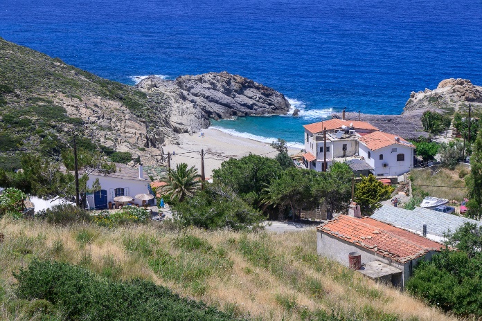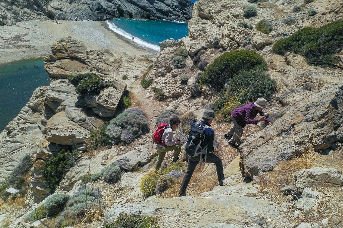 | Nach dem wir eine gewisse Hohe erreicht hatten kamen wir auf einen breiten Fahrweg mit einer schönen Sicht über dem tiefblauen Meer. Wir könnten diesem Naturstrasse mit einige Auf- und Abstiege den ganzen Weg bis Kato Raches oberhalb von der Nas Bucht folgen. Unterwegs gab es einen alten Dreschplatz und auch interessante Blumen und Insekten zu beobachten. | |