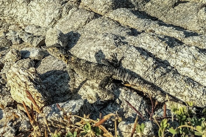 | Treppen führten hinunter zur Hauptstrasse und dann weiter über Felsen zum Meer. Unten sahen wir schon den Hauptteil unsere Gruppe bei der Tempelruine. Um das Meer zu erreichen musste man zuerst eine Lagune überwinden. Dies wurde in verschiedene ‘Outfits’ bewältigt oder man kletterte einfach über die Felsen, die von Echsen bevölkert waren. Das Meer war etwas unruhig aber nicht zu kalt und man könnte ein Bad geniessen. Nachher gab es ein wohl verdientes Bier. | |