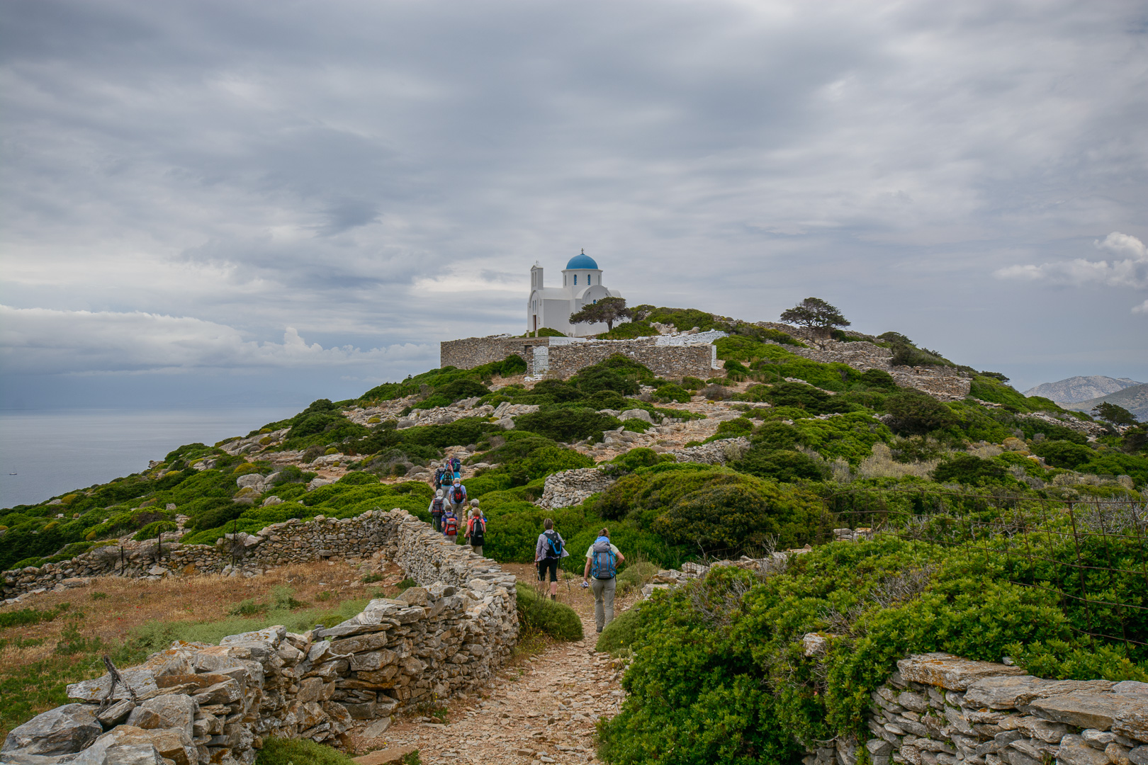Vor Jahrhunderte haben sich die Bewohner in dieser vom Meer nicht einsehbaren Bergmulde in unauffälligen Steinhäusern vor Piraten versteckt. Langada wird deshalb auch als „unsichtbarer Ort“ bezeichnet. Hier beginnt unsere 6.0 km lange Höhenwanderung, die ohne grosse Höhenunterschiede auf einer Höhe von etwa 740 m leicht abwärts im Bergdorf Vrakades endet. |