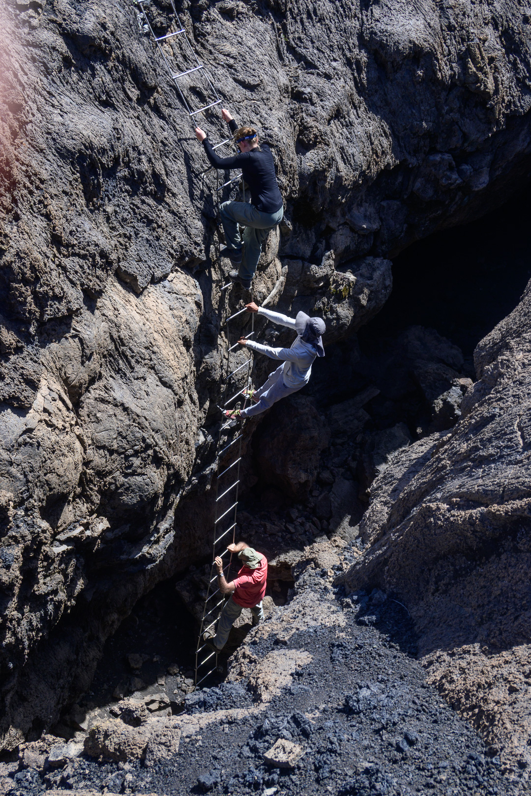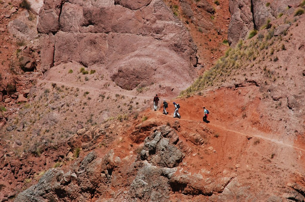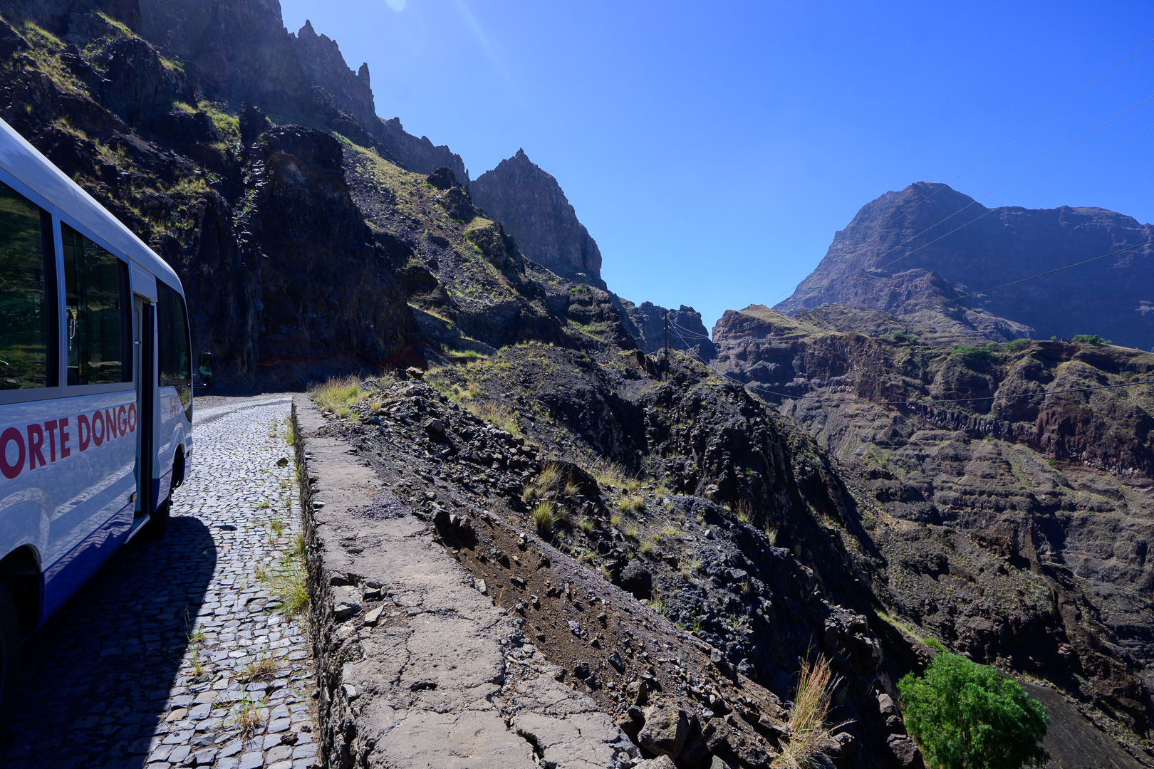 Die geteerte Autostrasse verwandelt sich kurz danach in eine unbefestigte Lehmstrasse. Sie ist Basis ist für eine neu zu bauende Autostrasse. Der Fahrweg führt durch erodierte Felsformationen leicht bergaufwärts. Die Personen auf der rechten Sitzplatzseite können von der Leitplanken-freien Lehmpiste direkt in einen Abgrund sehen (!) |