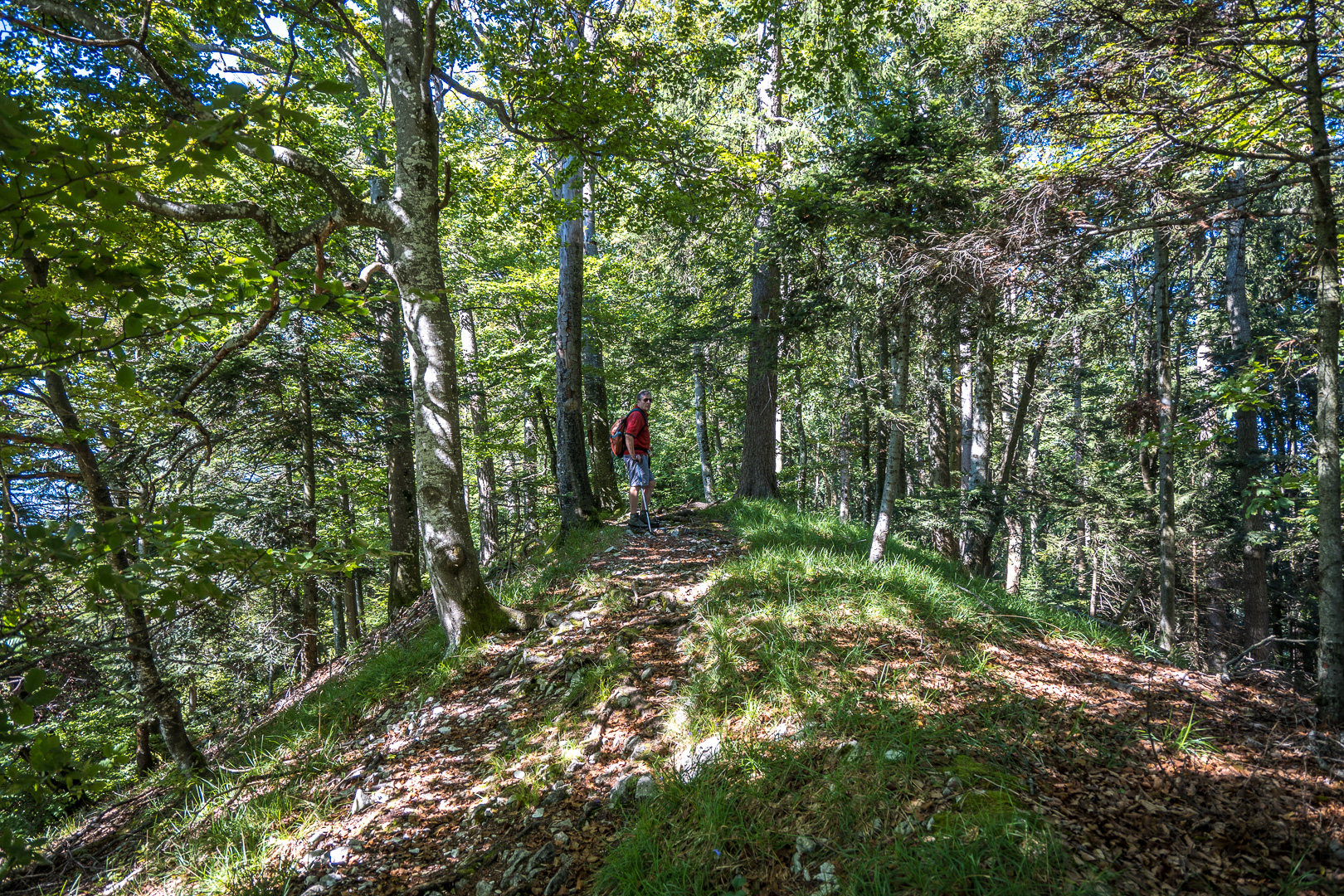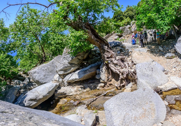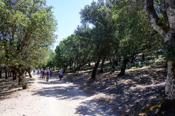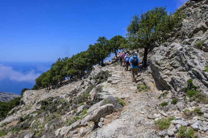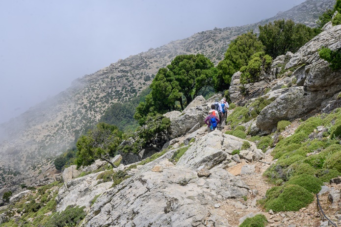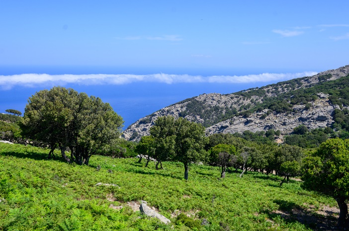 Wir befinden uns stets auf der linken Flanke des 956 m hohen Berges Krabi.Der Wanderweg ist weitgehend mit grossen Pflastersteinen und Stützmauern angelegt. Er führt mal durch ebene Kermeseichen-Haine, dann wieder durch felsige Hänge mit starkem Gefälle. Der Blick auf das Ägäische Meer und die unverbaute Küstenregion ist beeindruckend. Oft werden wir von Nebelschwaden überrascht, die vom Meer den Hang entlang nach oben ziehen. |