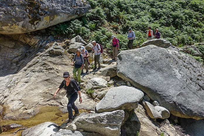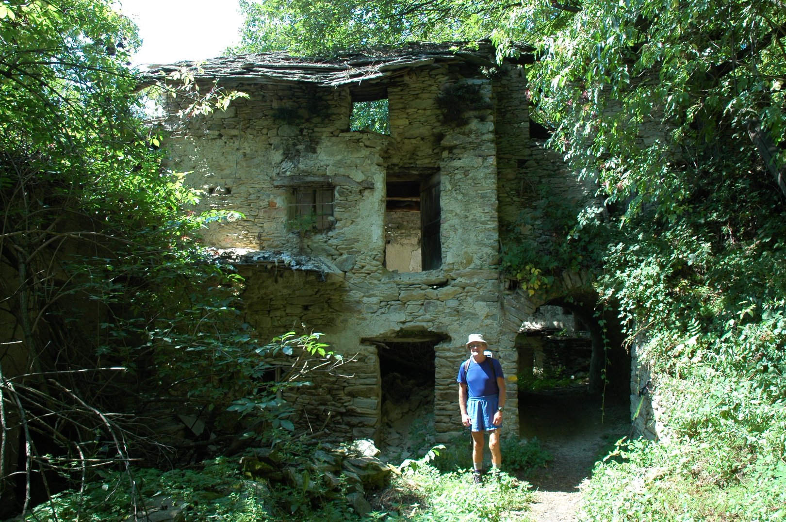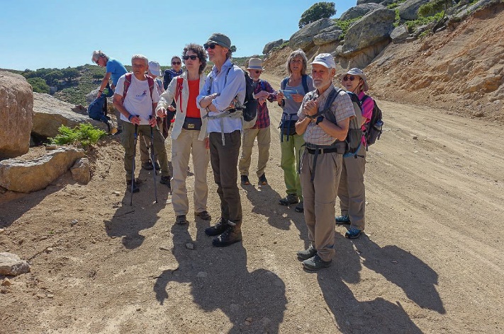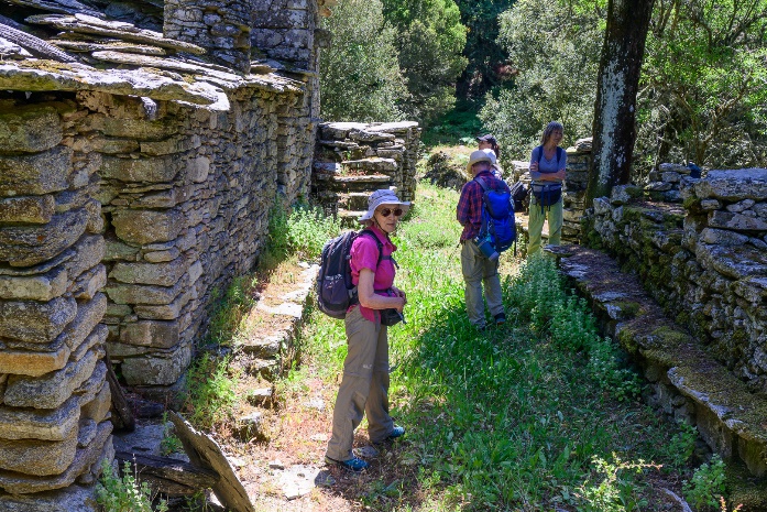 Kurz nach Verlassen von Langadastossen wir, versteckt im Wald und Gebüsch, auf ein altes, uriges Steinhaus mit Schieferdach und Kaminen. Es ist das ehemalige Gemeindehaus aus dem 17. Jahrhundert. Nach ausgiebiger Aussen– und Innenbesichtigung geht es weiter, vorbei an Kermeseichen, stacheligen Büschen und grossen Felsbrocken. Um 12:45 Uhr manchen wir eine Trinkpause und Christina liest uns einen Zeitungsartikel über das schicksalhafte Leben von Miki Theodorakis vor, der in einem Steinhaus in Vrakades lebte, als er auf Ikaria verbannt war. |