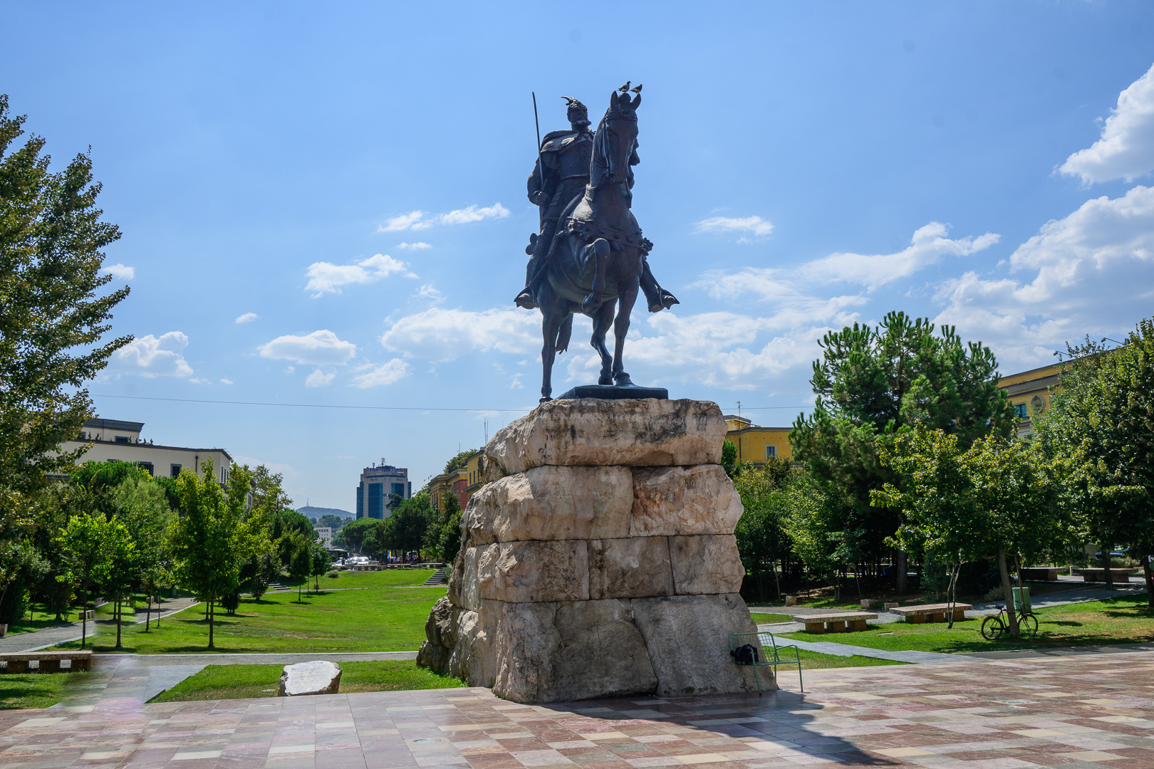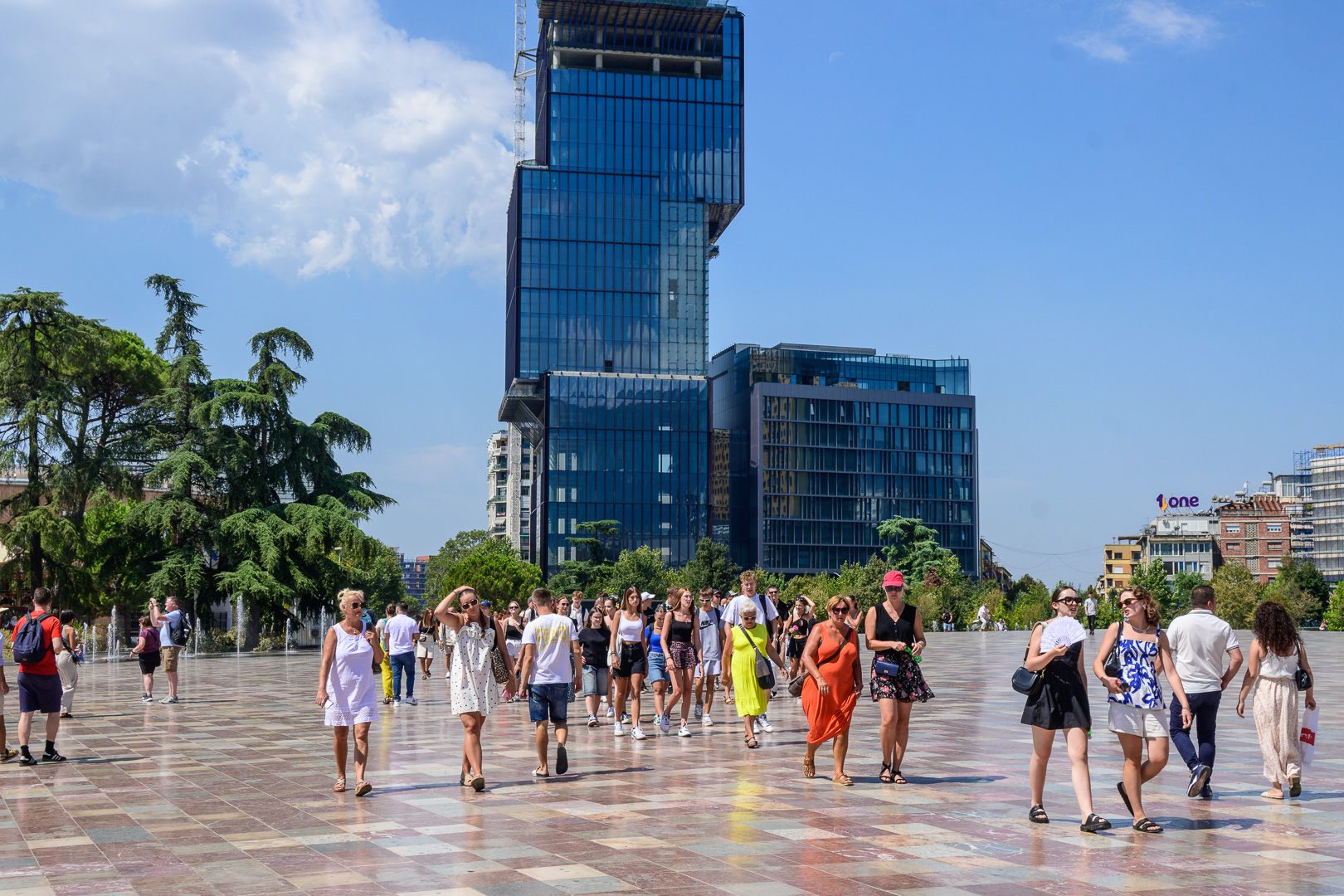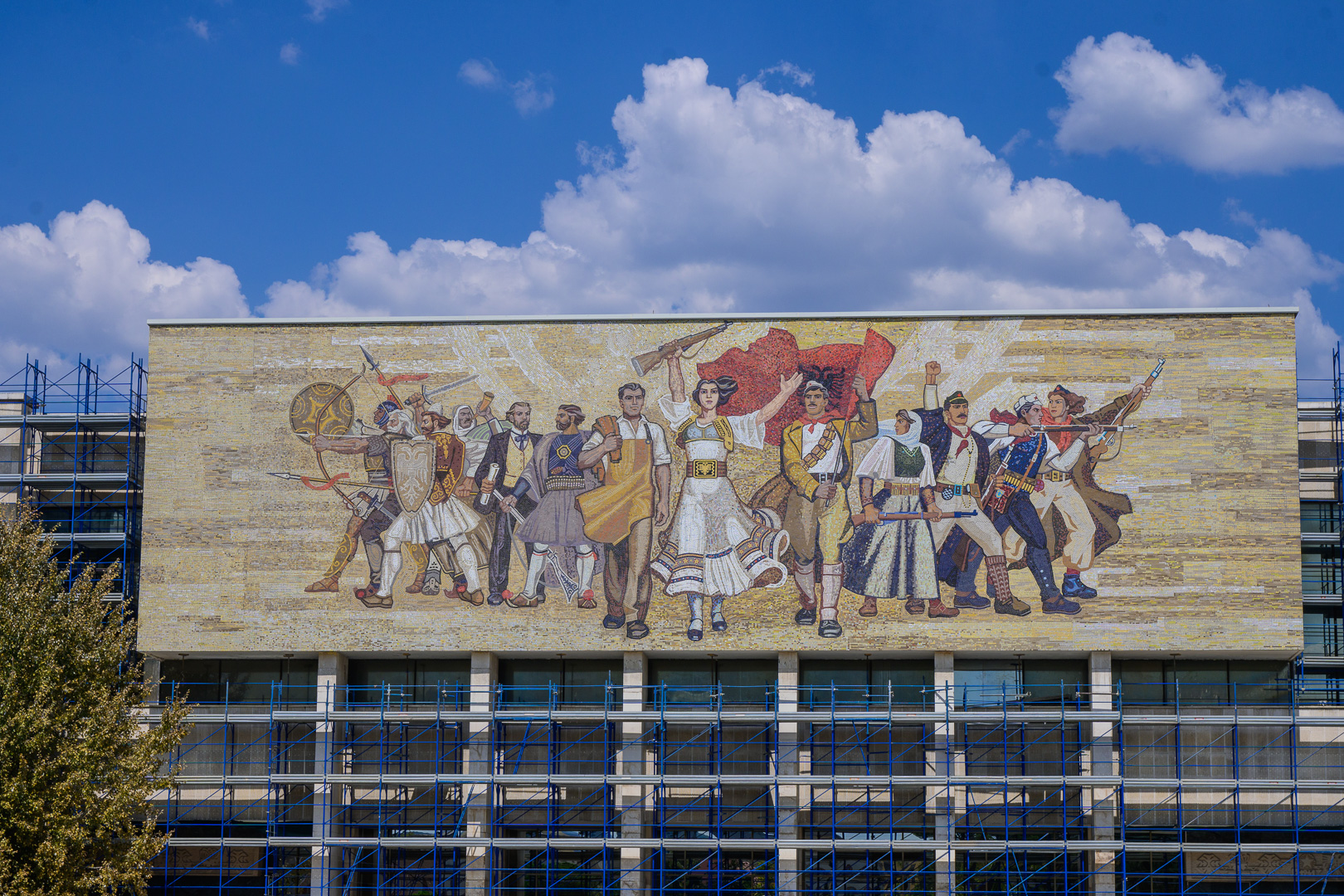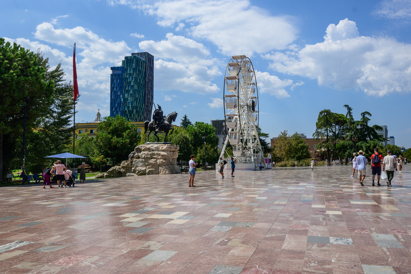 Mein Direktflug von Basel mit Wizzair flog montags nicht, daher reiste ich einen Tag vor der Gruppe. Der Flug hatte jedoch Verspätung und ich kam schließlich nach Mitternacht an, nur um festzustellen, dass meine Hotelbuchung nicht registriert worden war! Ein langes Telefonat löste schließlich das Problem und ich konnte schlafen. Am nächsten Tag musste ich wie geplant das Hotel wechseln und durchquerte das Zentrum von Tirana zu Fuß mit meinem Gepäck. Ich hielt auf dem sehr großen und beeindruckenden Skanderbeg-Platz an, um ein angenehmes Salat-Mittagessen vor dem Opera Gebaude.(Kultur Palast) zu genießen. Es gab einen Buchladen in der Nähe, aber sie hatten keine neuen Karten oder Reiseführer, nur Reiseberichte. Nach einigem Suchen fand ich mein neues Hotel und machte nach dem Einchecken einen kurzen Abstecher zum nahegelegenen ‘New Market’. Die anderen traf ich am Abend.