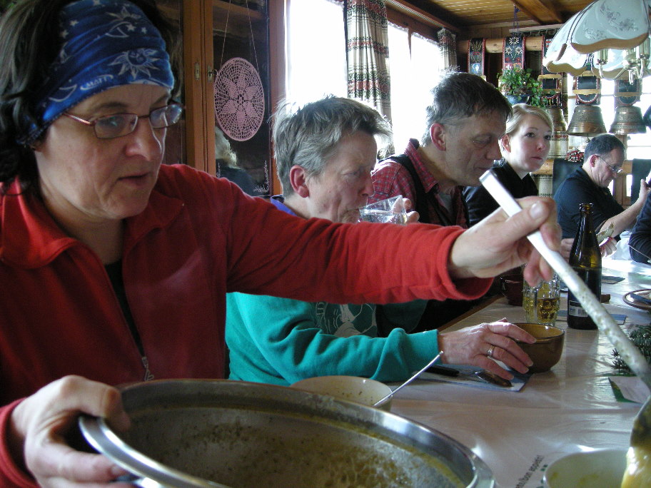 Jean, Regina und Brigitte machen sich in Ermangelung passender Schuhe schon mal langsam auf den Rückweg zu unserem Bus und bestaunen unterwegs die Bauarbeiten mit den schon angelegten Parkplätzen zum Empfang der Massen an den Thermalbecken. Linkerhand sehe ich einen Campingplatz, auf den wir drei nun zusteuern in der Hoffnung auf ein kühles Bier, was wir auch tatsächlich bekommen. Die Rückfahrt nach Permet gestaltet sich sehr ruhig, denn die meisten genehmigen sich ein Nickerchen. Das Abendessen nehmen wir im gleichen Restaurant Antigonea wie am Vorabend ein, aber zuvor gönnen sich Jean, Regina, Brigitte und Liliane einen Apéro im Sonnenschein vor dem 1. Hotel am Platz. |