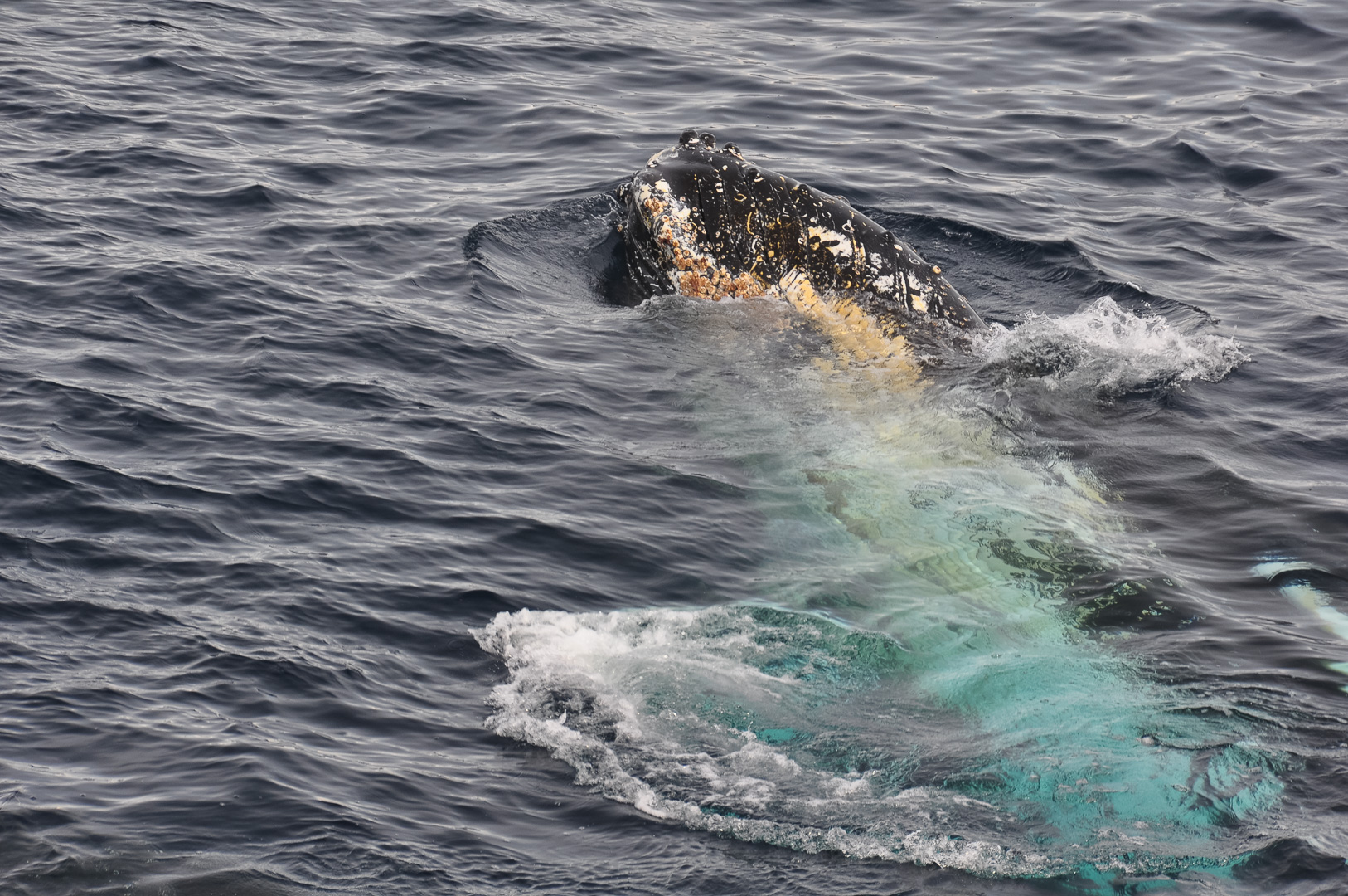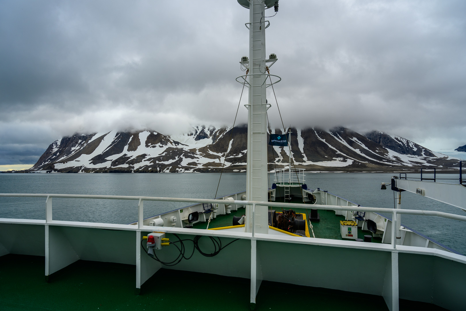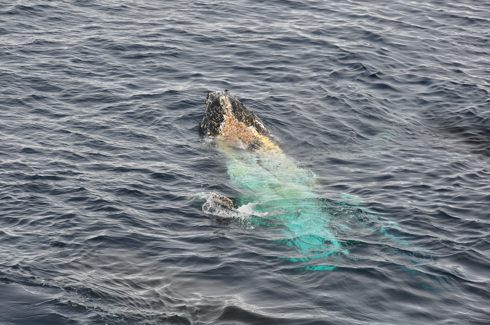 Before sailing into the southernmost fjord, Hornsund visibility around the ship was good, but Hornsund itself looked very foggy. Our destination was a place called Gåshamna, but we were soon distracted by a young humpback whale feeding right in front of the ship.It was curious and came so close that we could see the entire body, including the striking white flippers, beneath the water. It was foraging in very shallow waters, which meant the fluke was lifted many times, giving a clear view of its underside— a key feature for identifying individual whales.