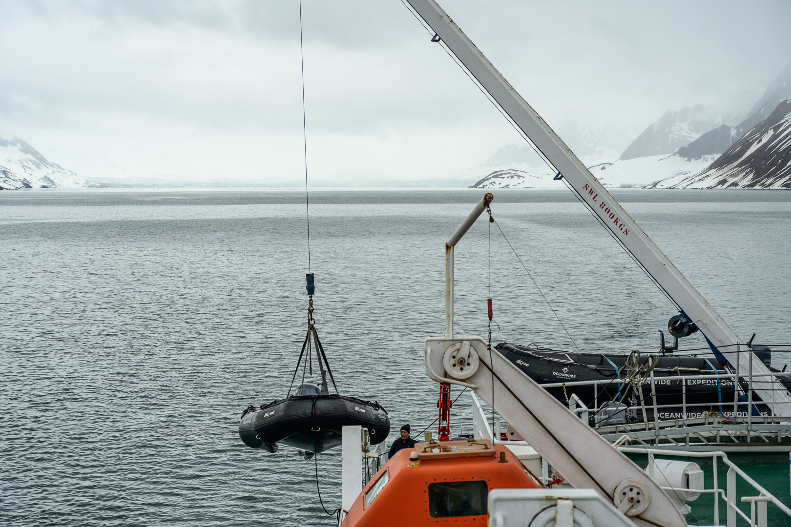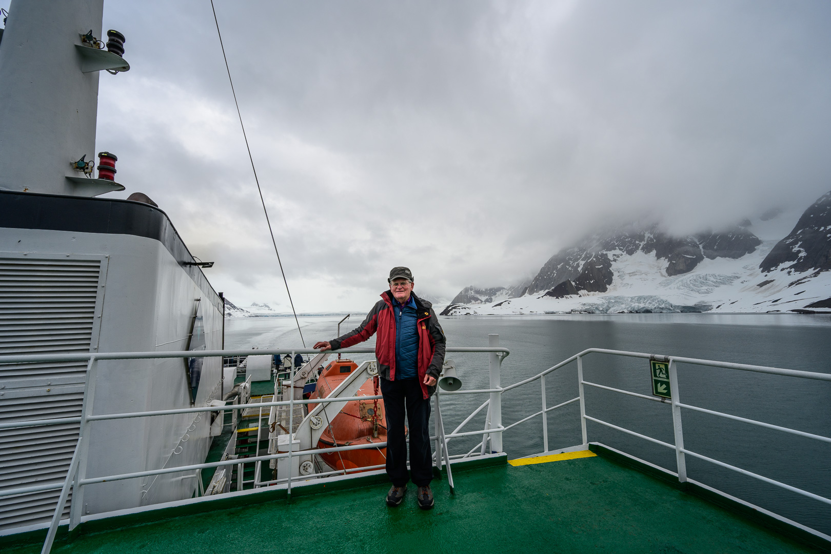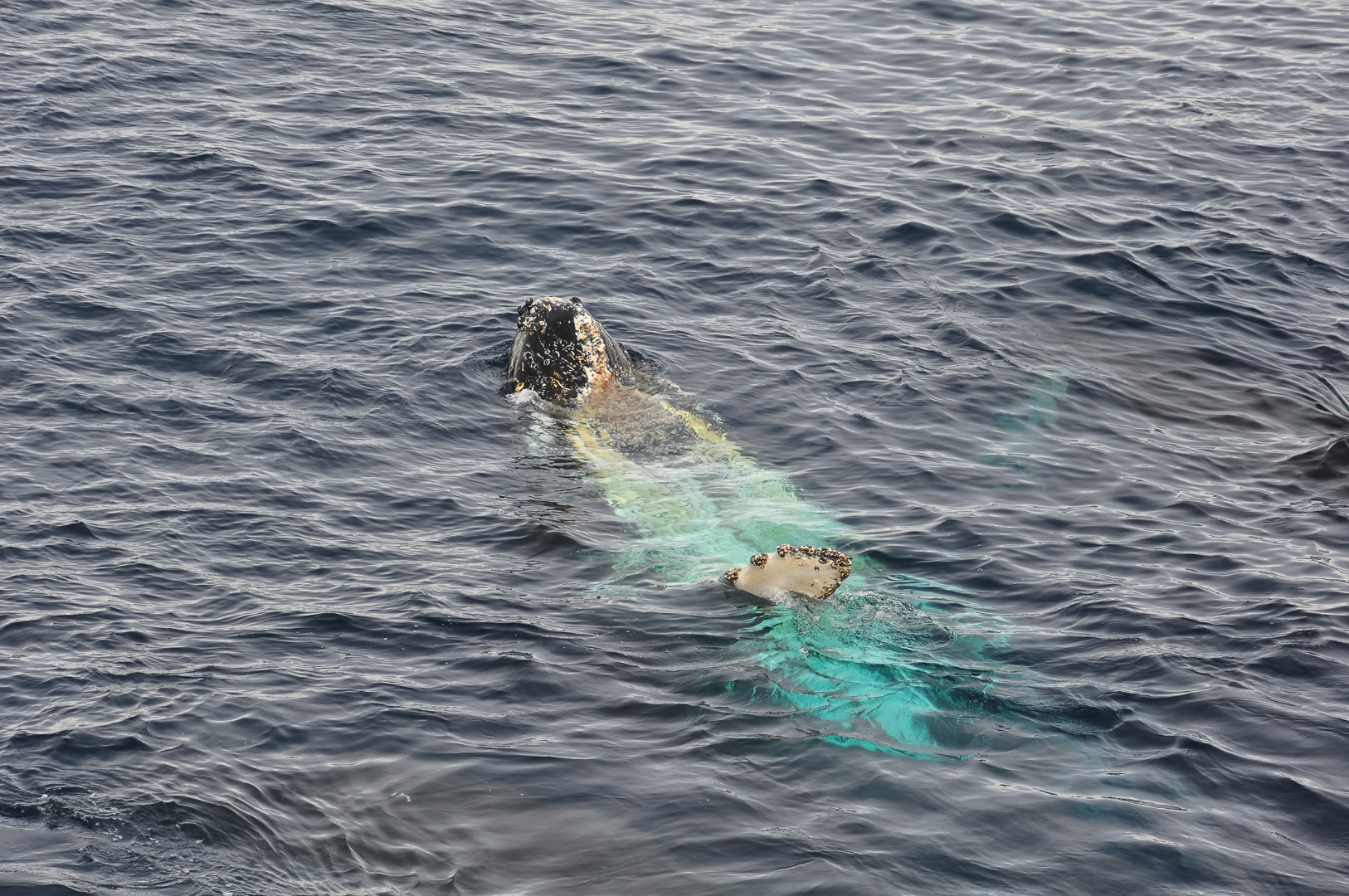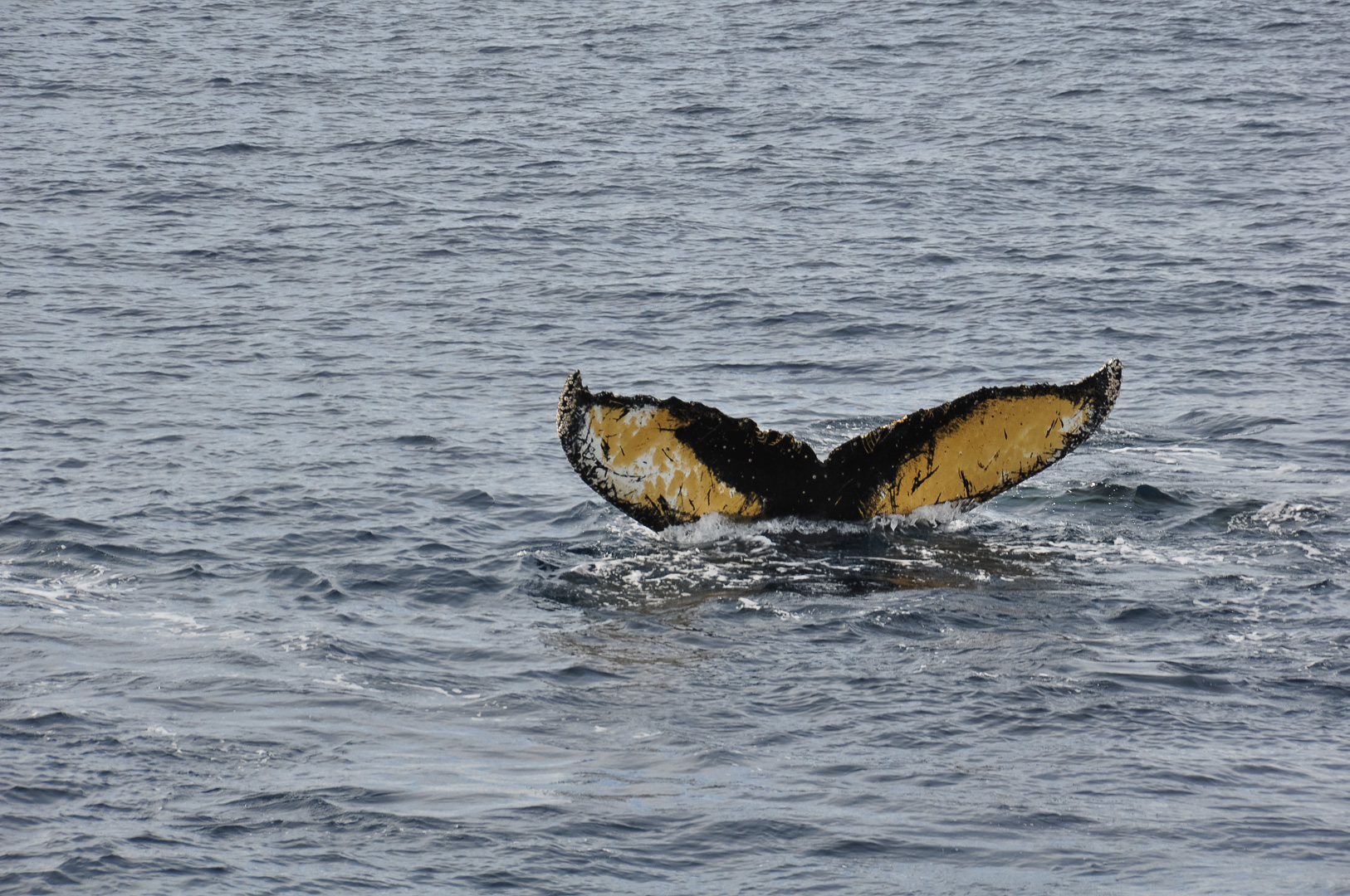 Before sailing into the southernmost fjord, Hornsund visibility around the ship was good, but Hornsund itself looked very foggy. Our destination was a place called Gåshamna, but we were soon distracted by a young humpback whale feeding right in front of the ship.It was curious and came so close that we could see the entire body, including the striking white flippers, beneath the water. It was foraging in very shallow waters, which meant the fluke was lifted many times, giving a clear view of its underside— a key feature for identifying individual whales.