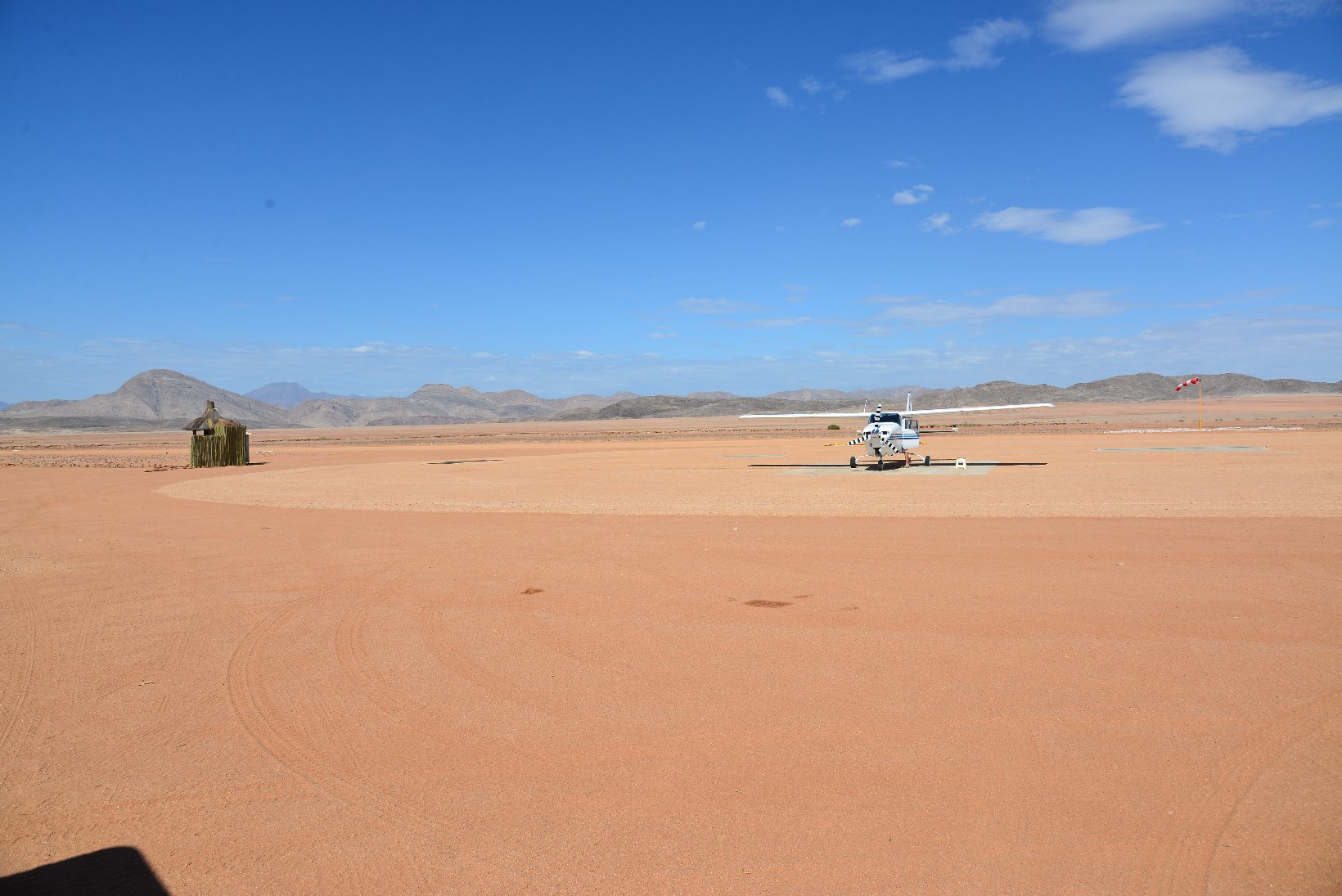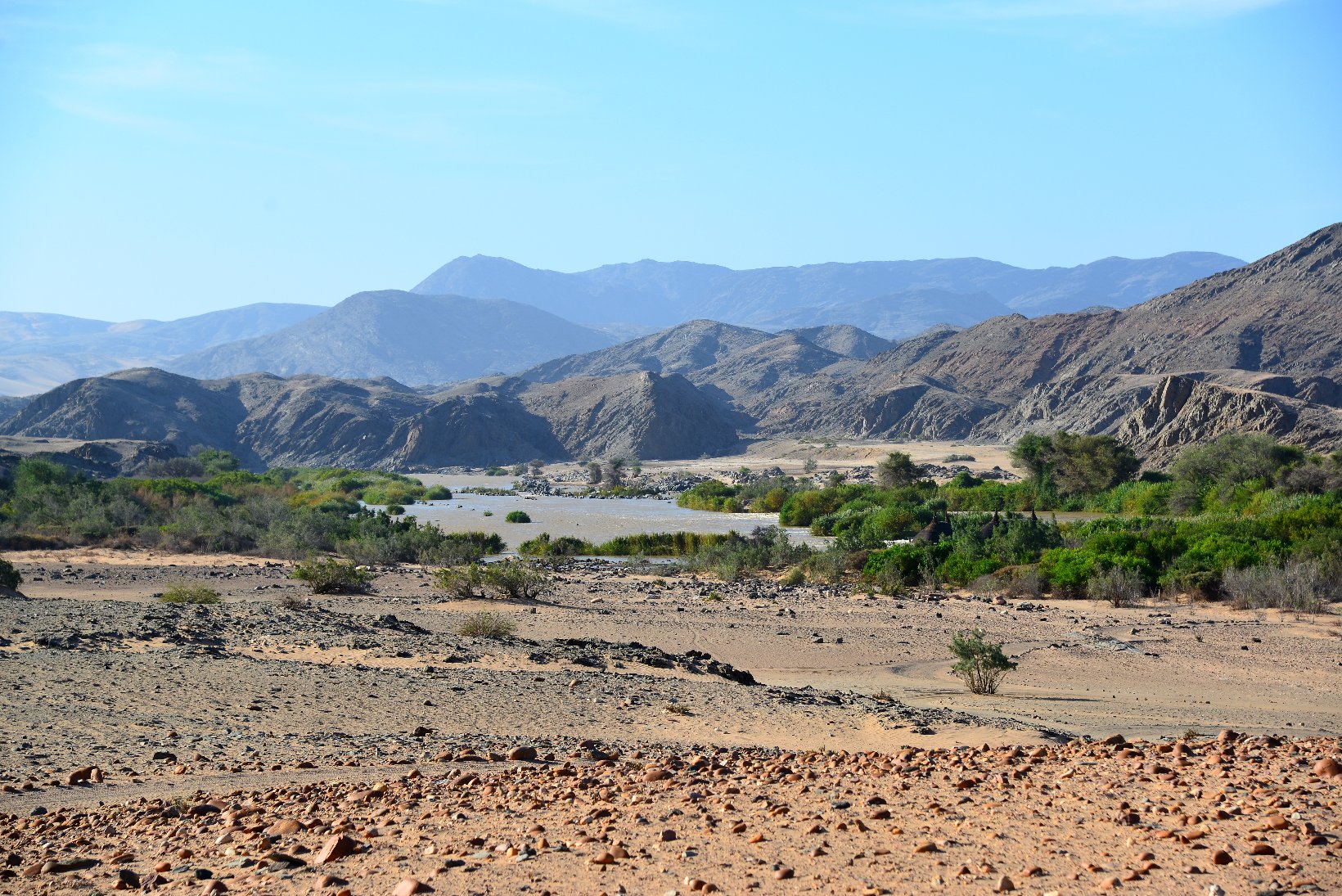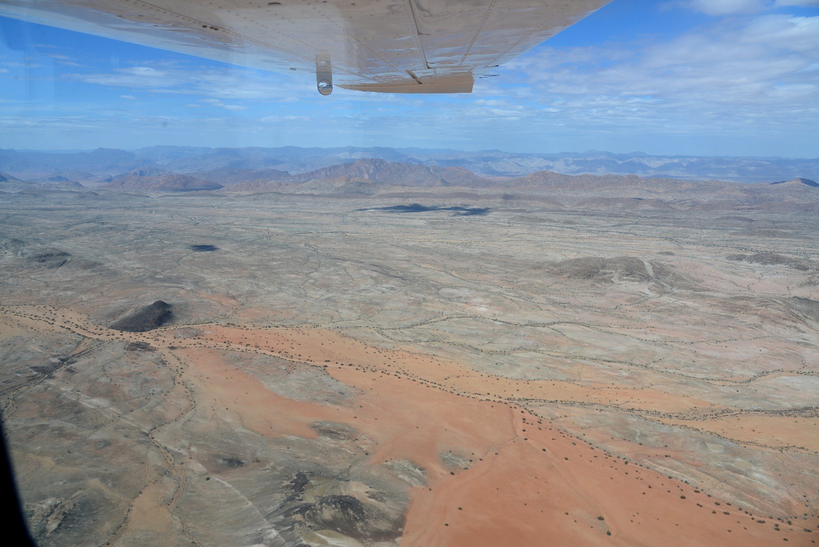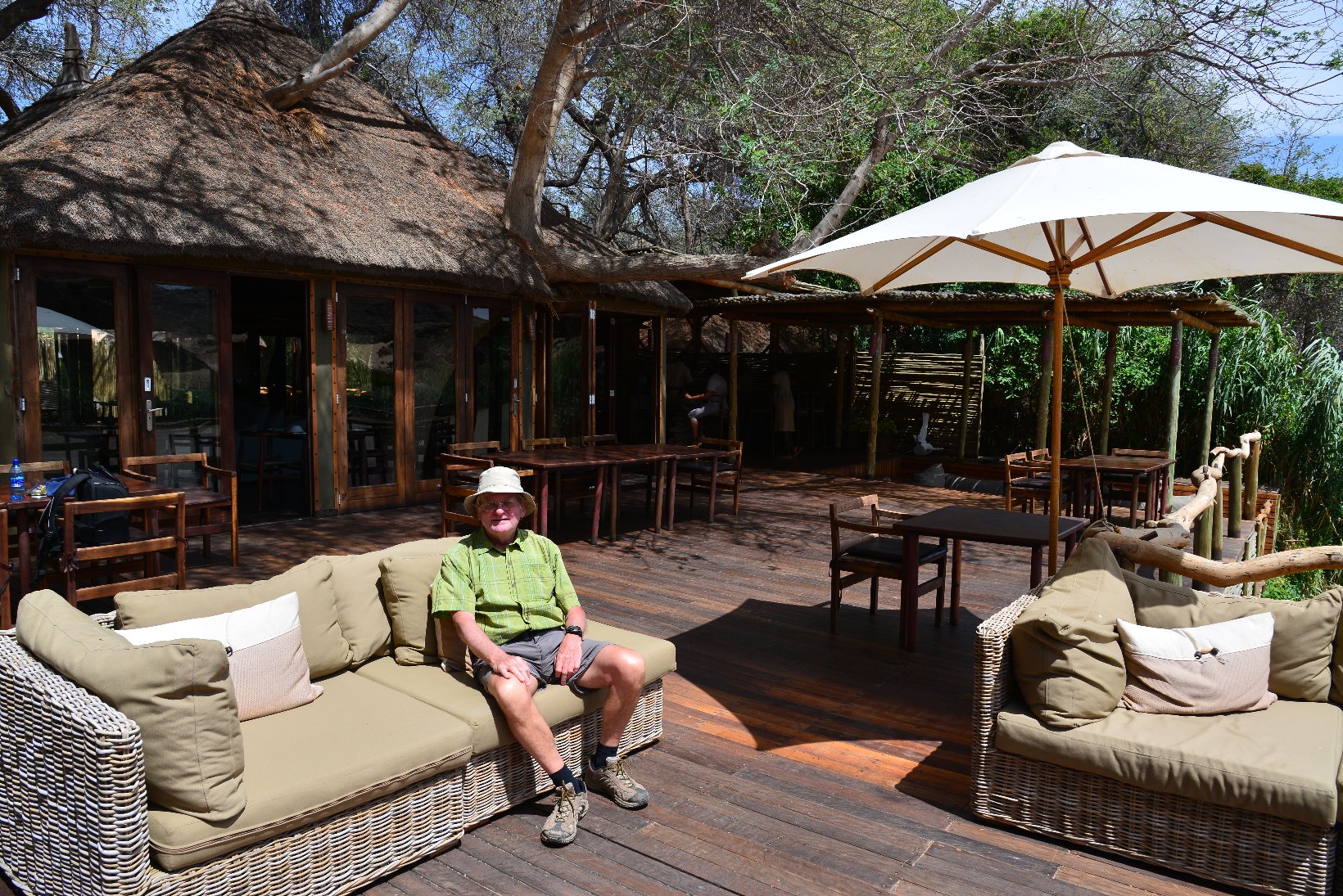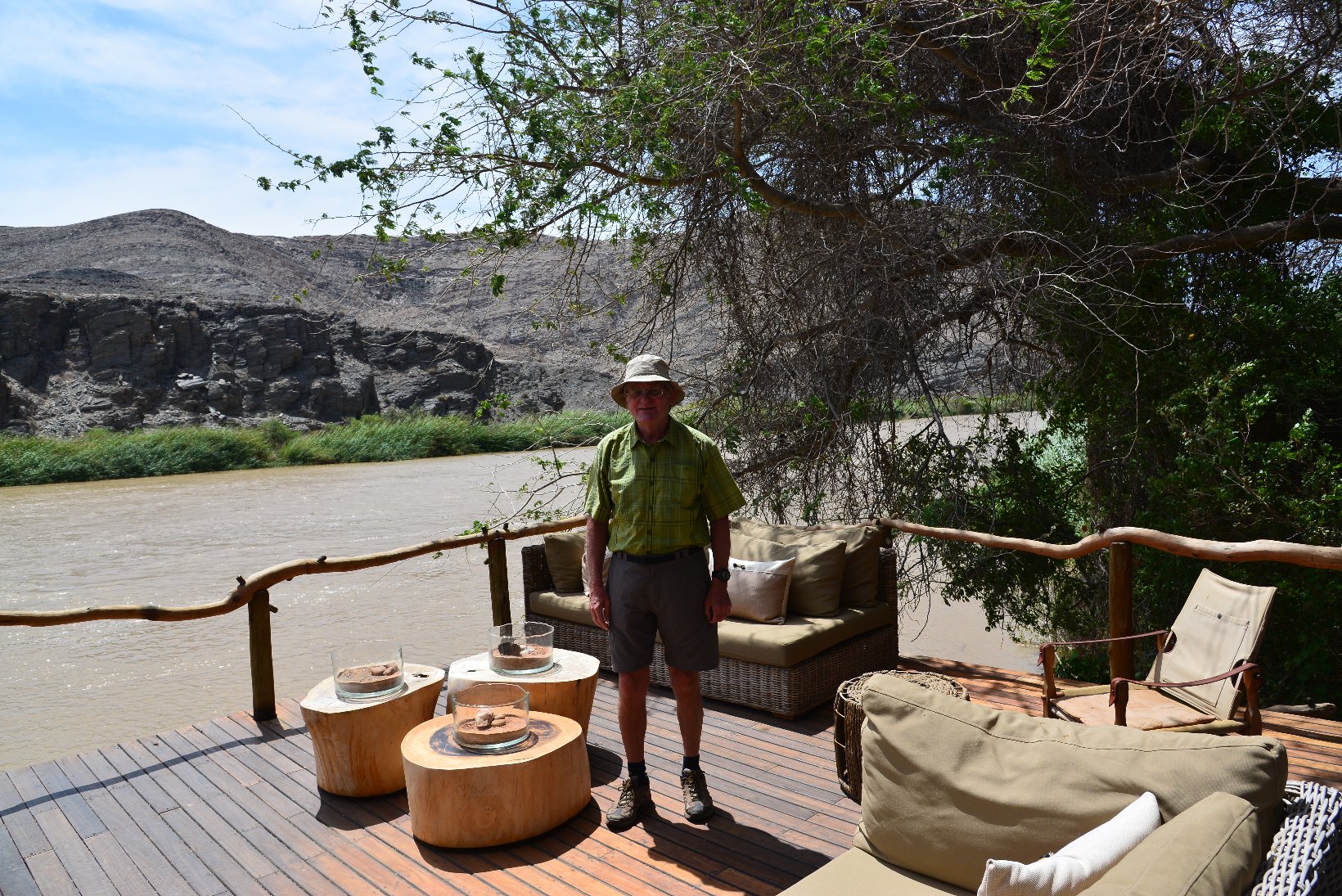 This lodge is situated at the most Northerly point of Namibia, right on the Angolan border. The Kunene river, which my luxurious suite directly overlooked, divides the two. There it was hotter and dryer than ever. There was phenomenal scenery on the flight: red mountains, black rocks and yellow sand. Nothing else for 1 1/2 hours. The scale is enormous. There was a map on the wall in the dining area of the lodge, which I at first took to be a walking map at a scale of 1:25,000 with only one road with 2 villages on it. Closer inspection revealed the scale to be 1:250,000! The whole of Switzerland would have fitted on a sheet of that size! The young pilot was called Moritz (not a joke). He had been brought up in Germany but had visited relatives in Namibia in his childhood. I was the only passenger and we had dinner together. Later the couple from Jersey came into the restaurant and I ended the evening with them. They left however the following morning for South Africa.