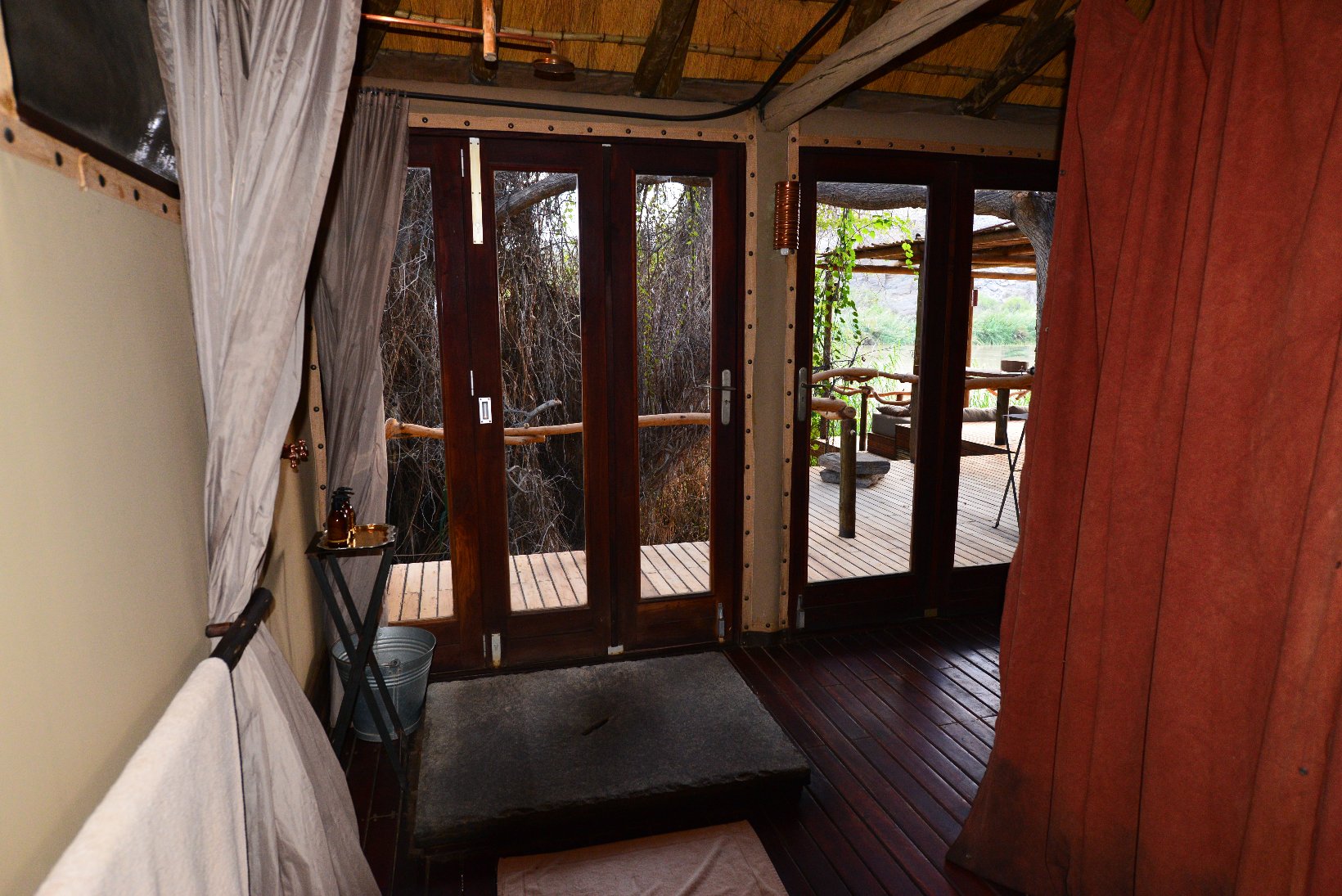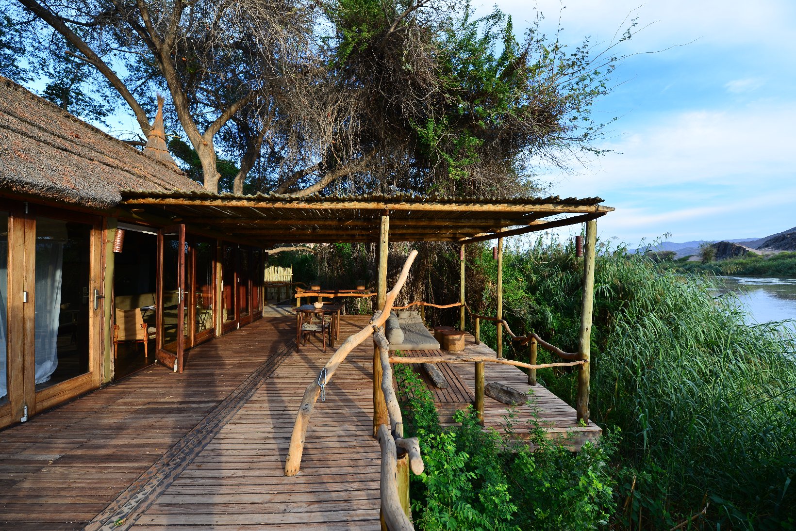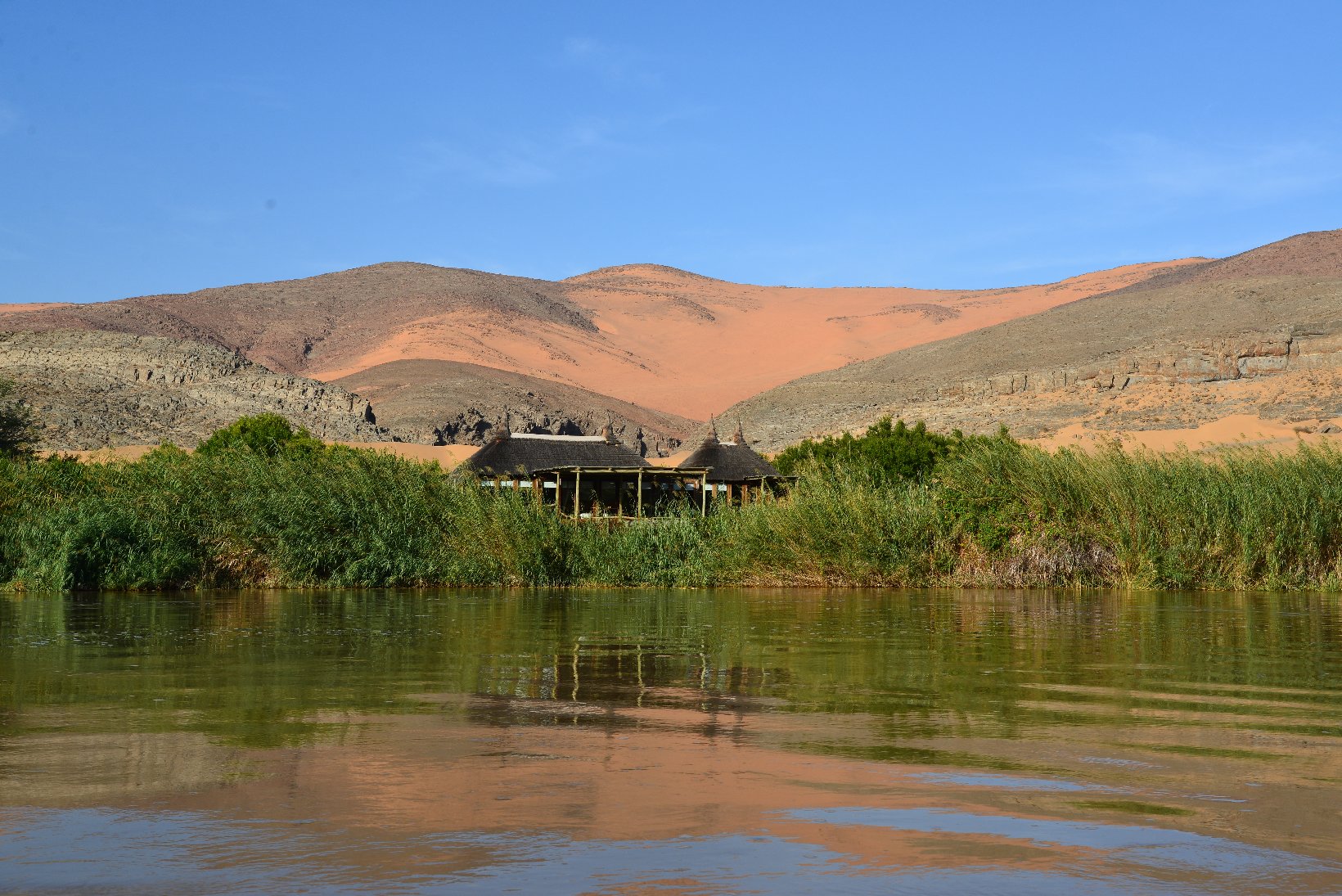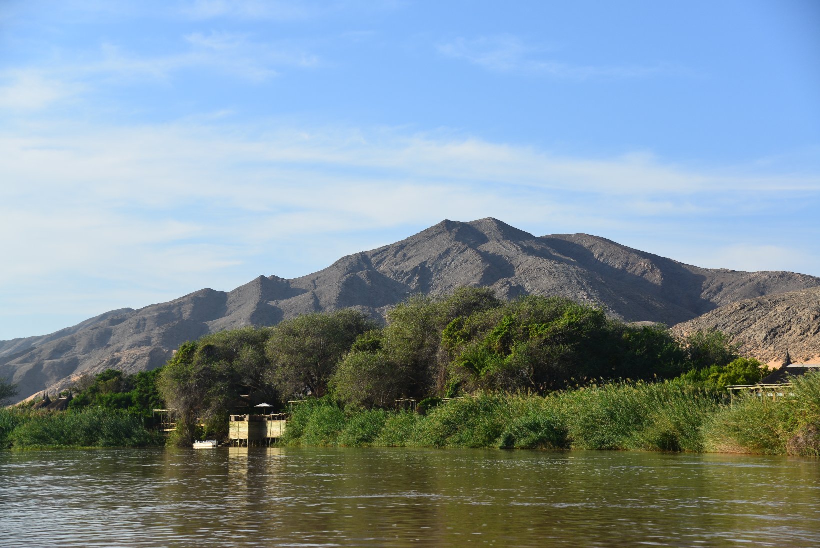 This lodge is situated at the most Northerly point of Namibia, right on the Angolan border. The Kunene river, which my luxurious suite directly overlooked, divides the two. There it was hotter and dryer than ever. There was phenomenal scenery on the flight: red mountains, black rocks and yellow sand. Nothing else for 1 1/2 hours. The scale is enormous. There was a map on the wall in the dining area of the lodge, which I at first took to be a walking map at a scale of 1:25,000 with only one road with 2 villages on it. Closer inspection revealed the scale to be 1:250,000! The whole of Switzerland would have fitted on a sheet of that size! The young pilot was called Moritz (not a joke). He had been brought up in Germany but had visited relatives in Namibia in his childhood. I was the only passenger and we had dinner together. Later the couple from Jersey came into the restaurant and I ended the evening with them. They left however the following morning for South Africa.