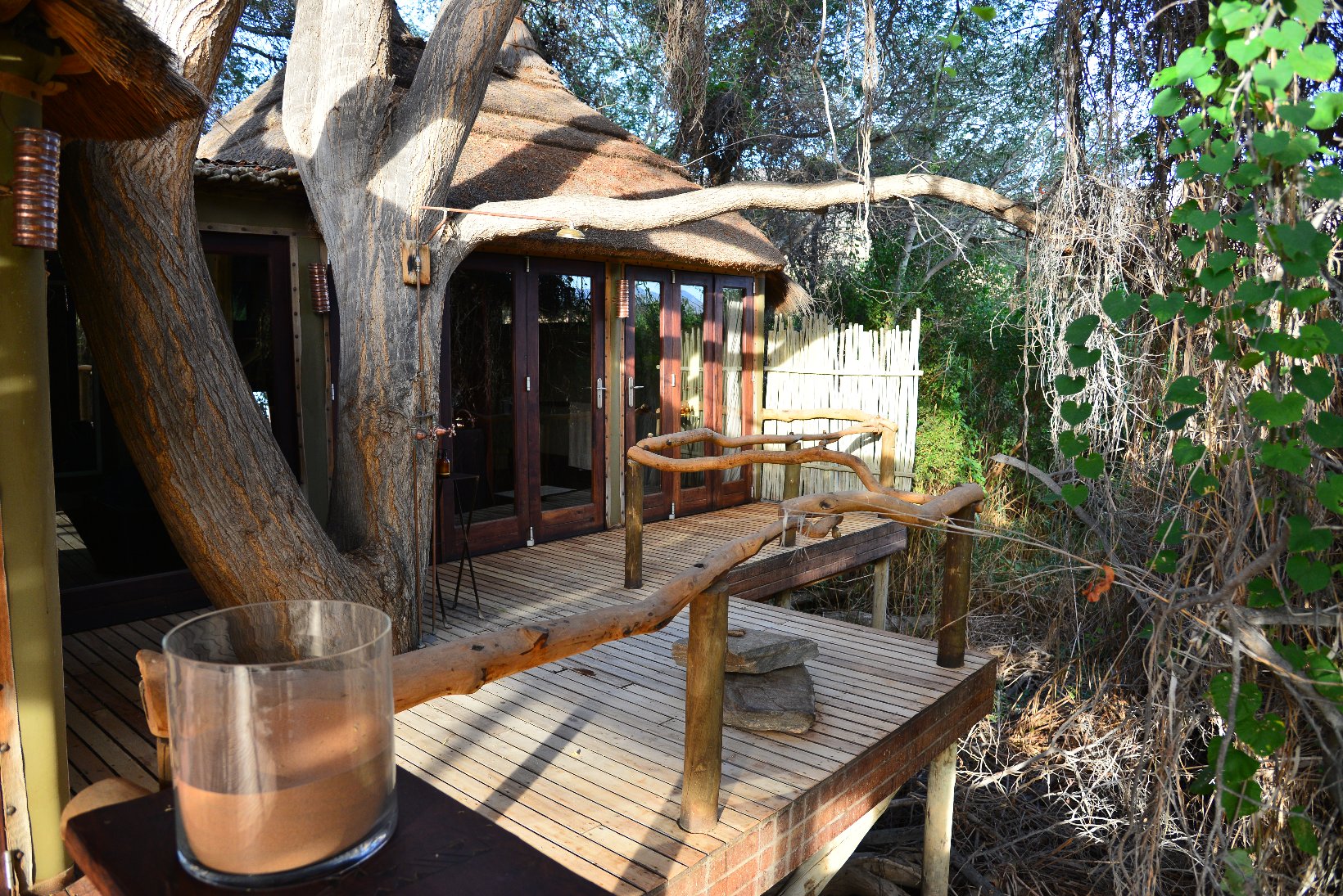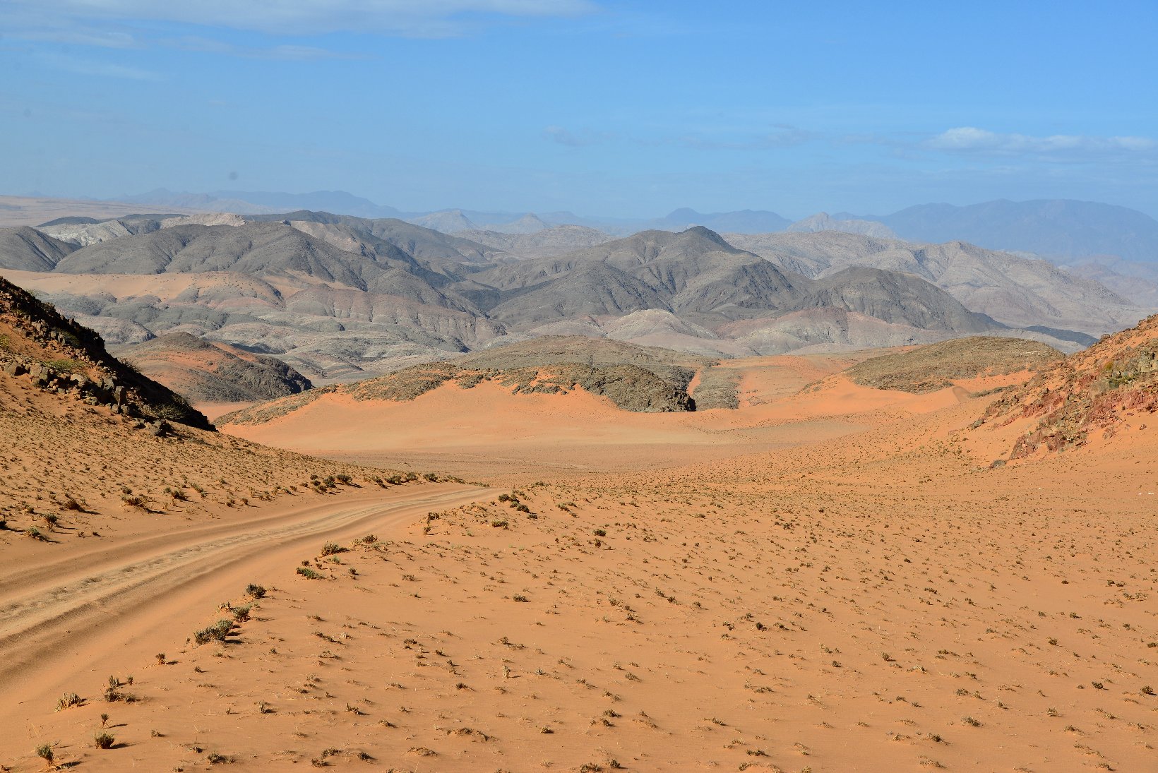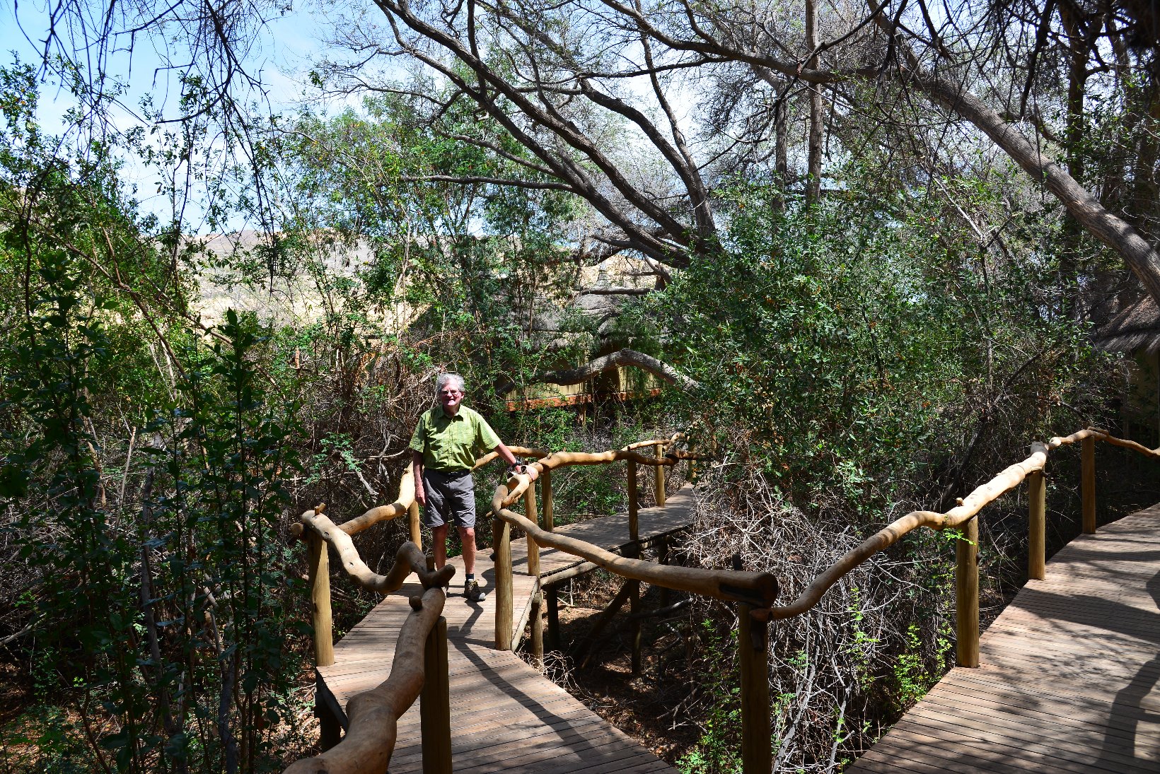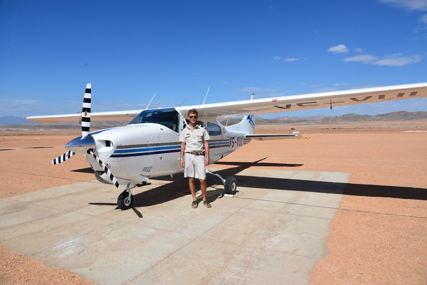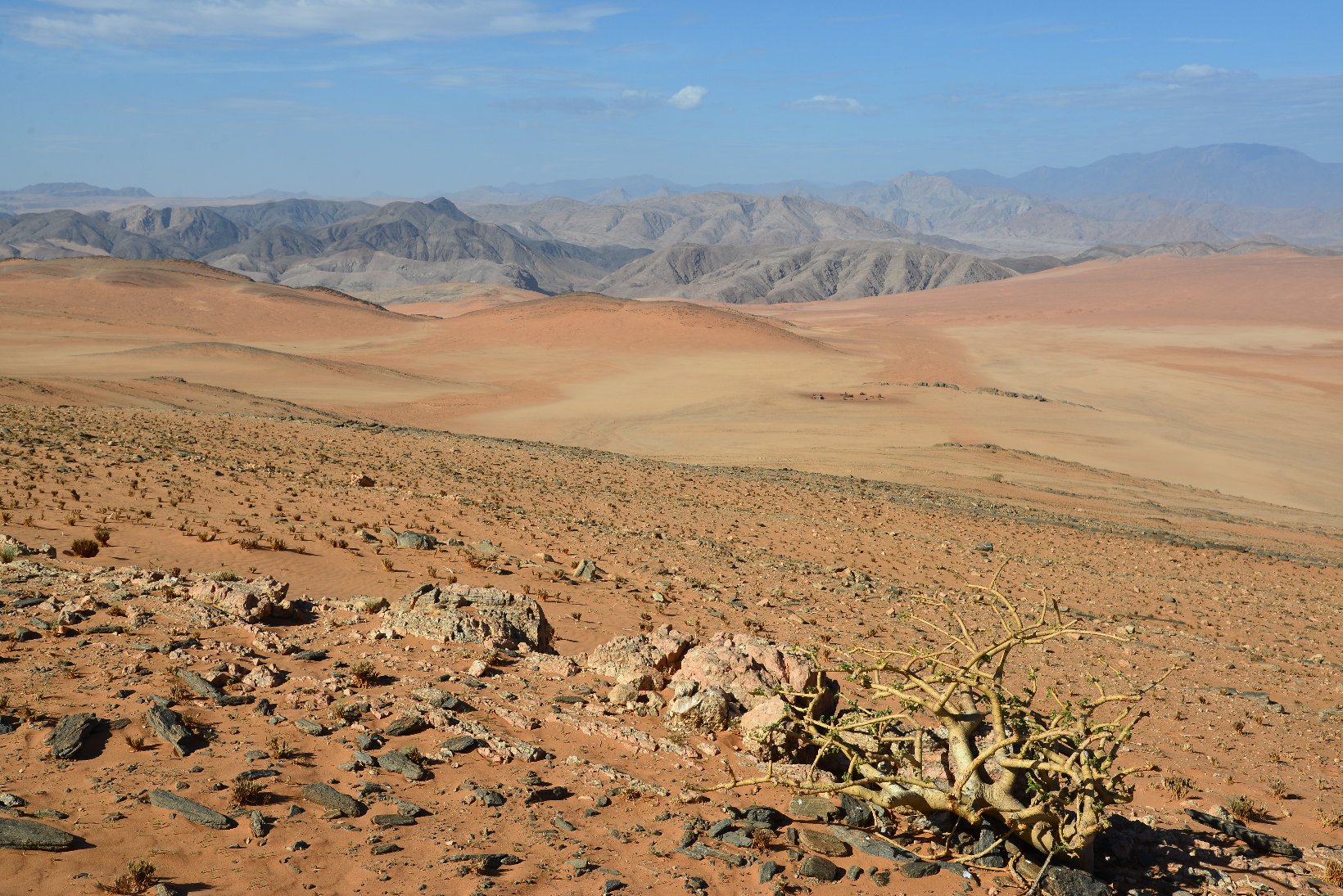 This lodge is situated at the most Northerly point of Namibia, right on the Angolan border. The Kunene river, which my luxurious suite directly overlooked, divides the two. There it was hotter and dryer than ever. There was phenomenal scenery on the flight: red mountains, black rocks and yellow sand. Nothing else for 1 1/2 hours. The scale is enormous. There was a map on the wall in the dining area of the lodge, which I at first took to be a walking map at a scale of 1:25,000 with only one road with 2 villages on it. Closer inspection revealed the scale to be 1:250,000! The whole of Switzerland would have fitted on a sheet of that size! The young pilot was called Moritz (not a joke). He had been brought up in Germany but had visited relatives in Namibia in his childhood. I was the only passenger and we had dinner together. Later the couple from Jersey came into the restaurant and I ended the evening with them. They left however the following morning for South Africa.