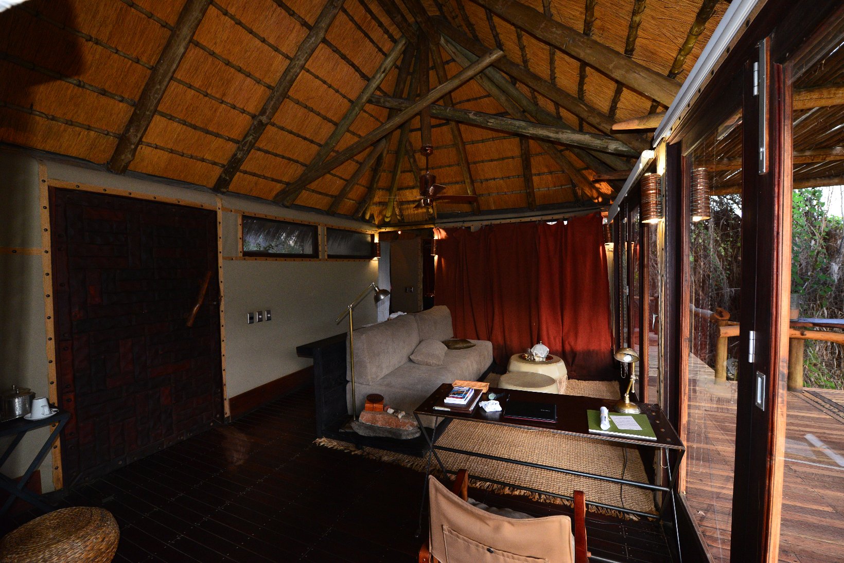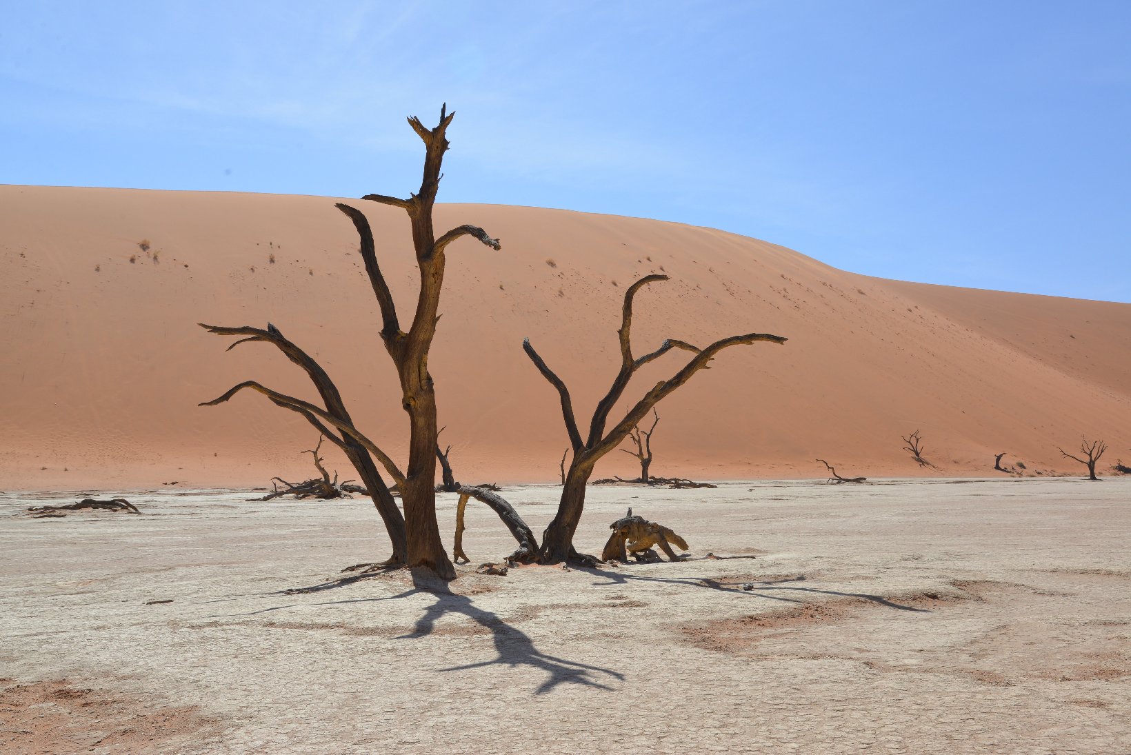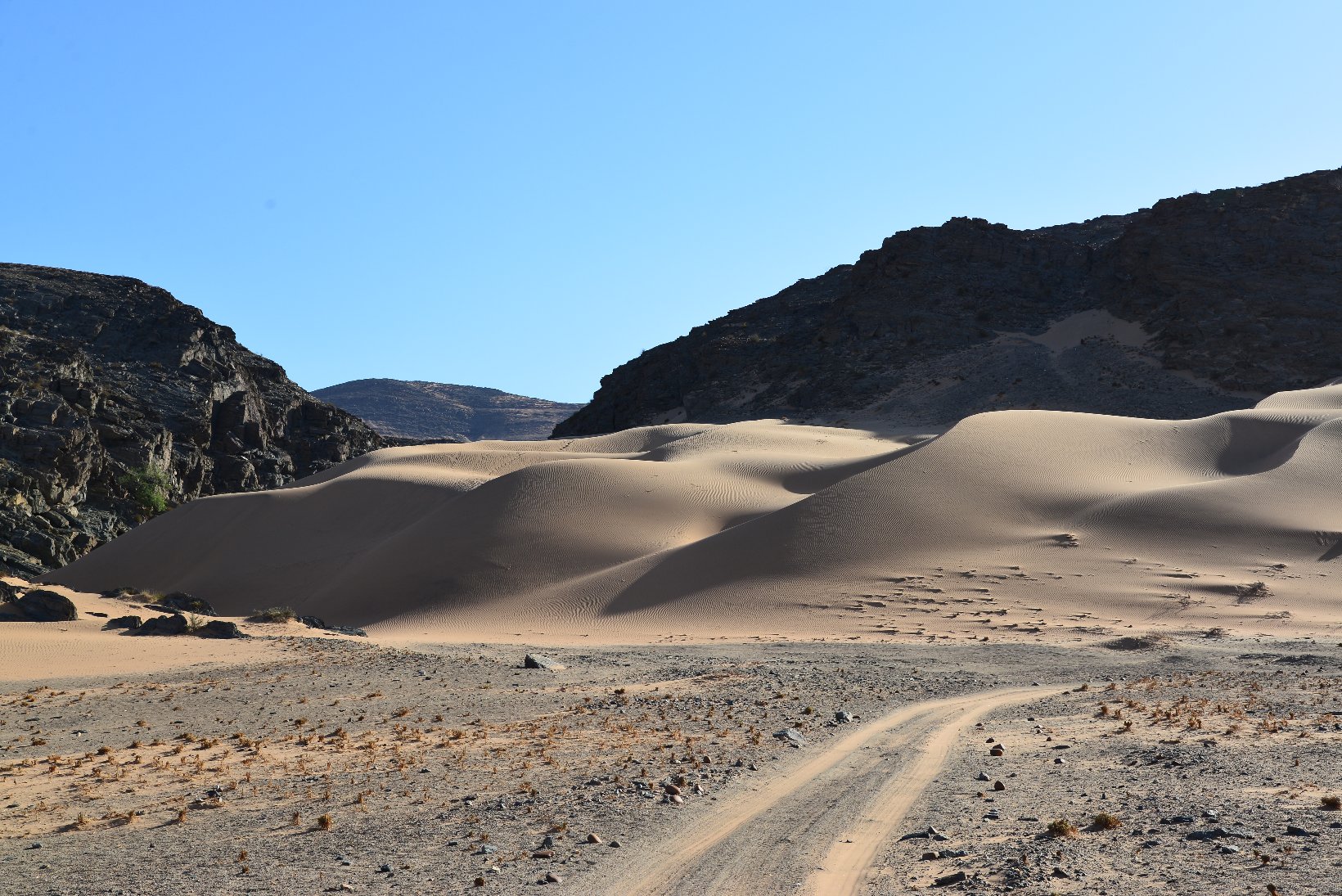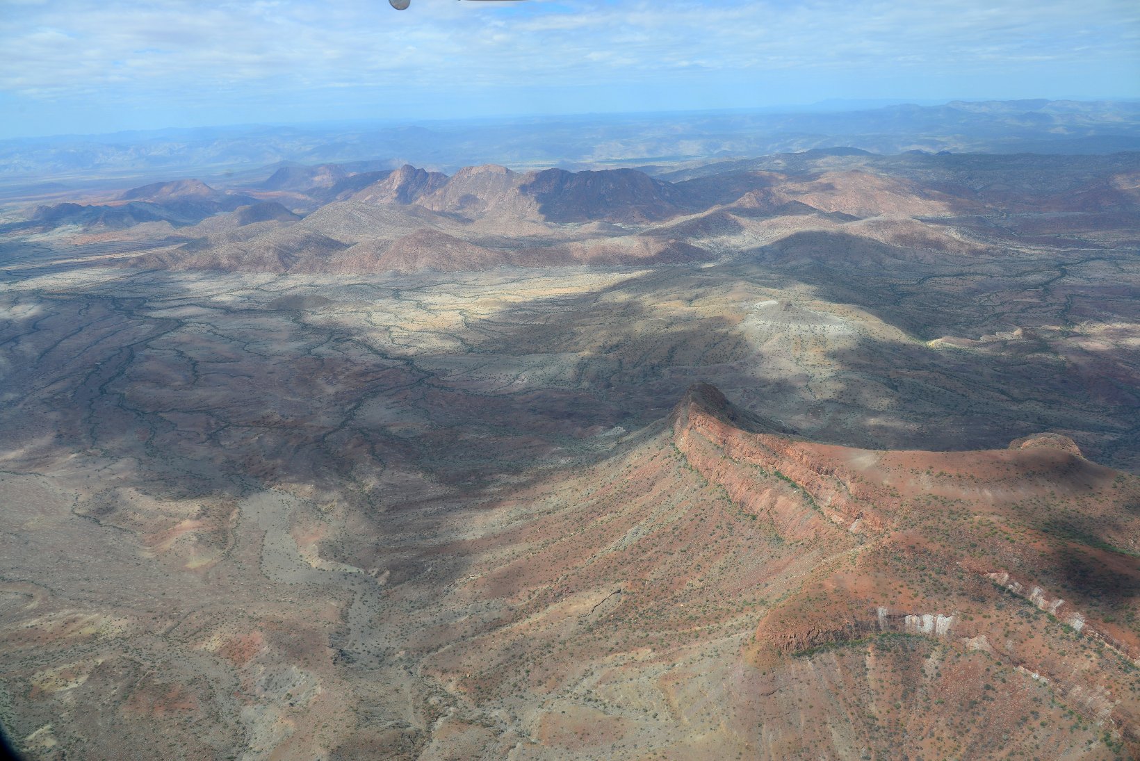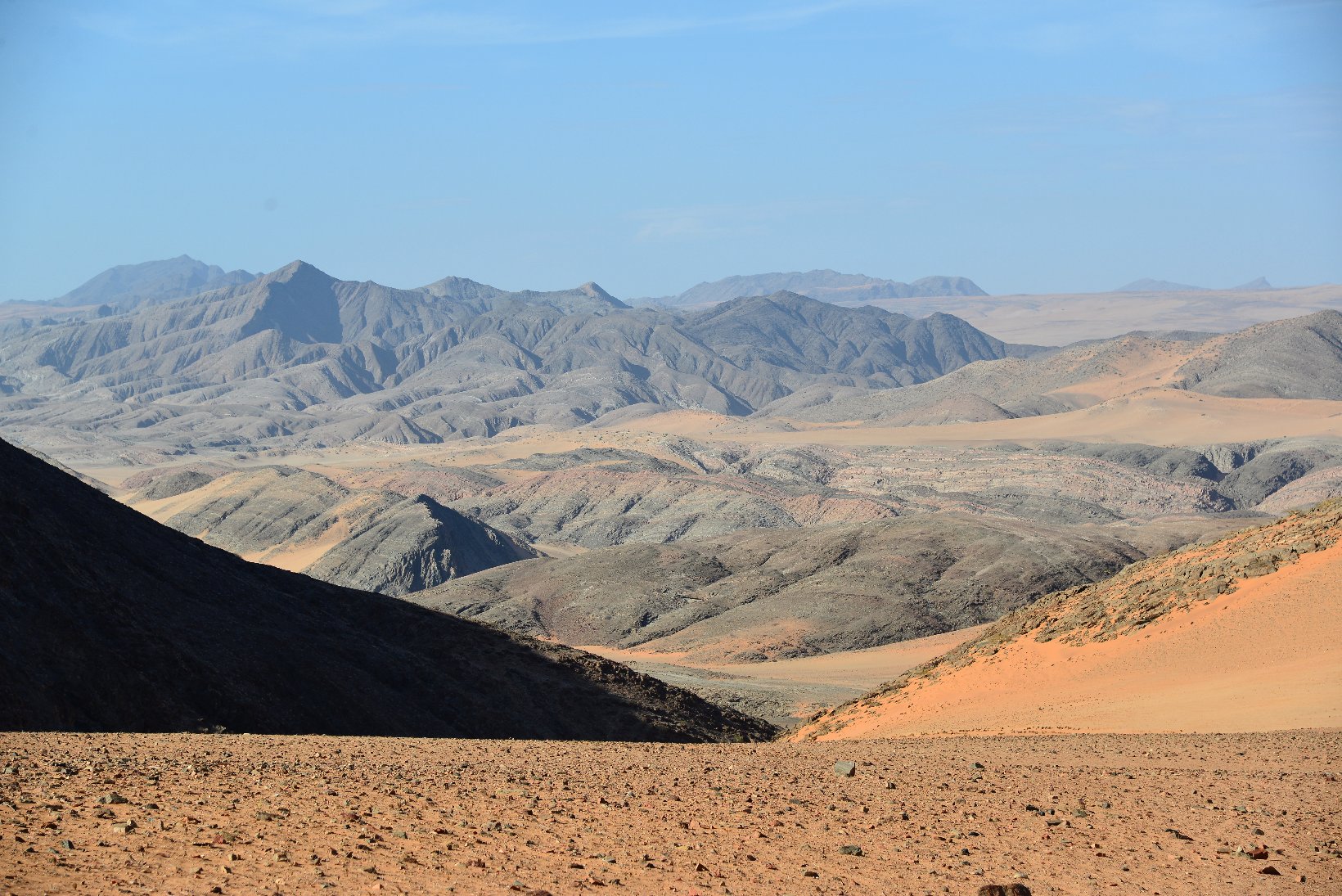 This lodge is situated at the most Northerly point of Namibia, right on the Angolan border. The Kunene river, which my luxurious suite directly overlooked, divides the two. There it was hotter and dryer than ever. There was phenomenal scenery on the flight: red mountains, black rocks and yellow sand. Nothing else for 1 1/2 hours. The scale is enormous. There was a map on the wall in the dining area of the lodge, which I at first took to be a walking map at a scale of 1:25,000 with only one road with 2 villages on it. Closer inspection revealed the scale to be 1:250,000! The whole of Switzerland would have fitted on a sheet of that size! The young pilot was called Moritz (not a joke). He had been brought up in Germany but had visited relatives in Namibia in his childhood. I was the only passenger and we had dinner together. Later the couple from Jersey came into the restaurant and I ended the evening with them. They left however the following morning for South Africa.