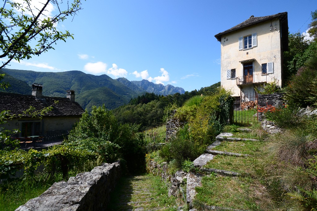 Nach einer Stunde Pause machen wir uns um 13.00 h wieder auf den Weg. Es geht kurz auf dem Strässchen bergab und dann steigen wir auf einem teilweise nassen Kuhpfad hinauf auf eine Anhöhe. Von dort aus wandern wir auf einem schmalen Bergpfad durch den Wald hinunter.