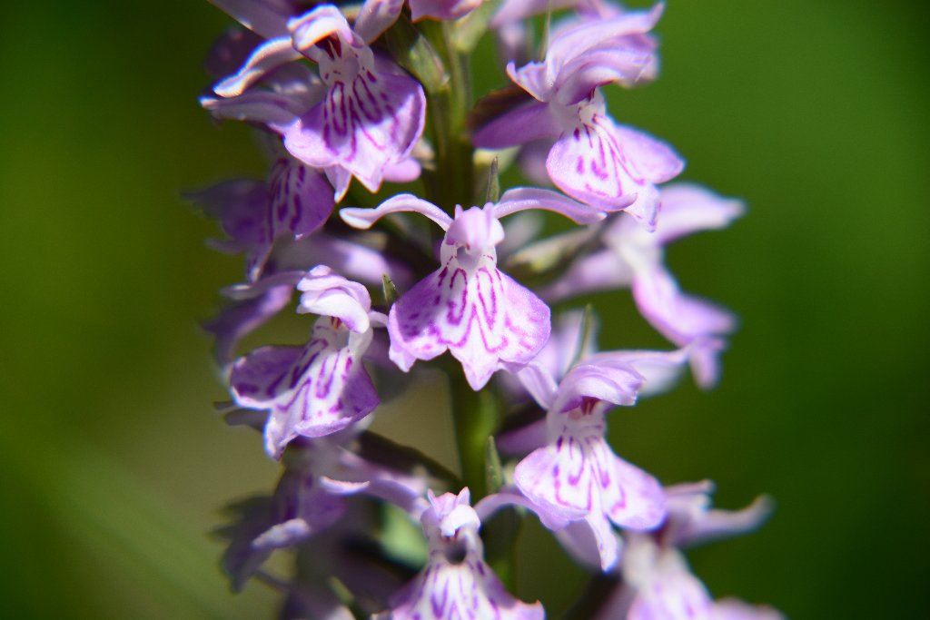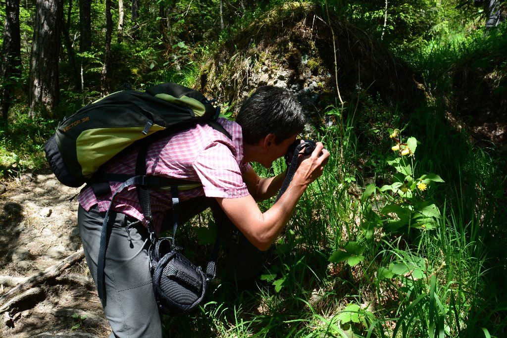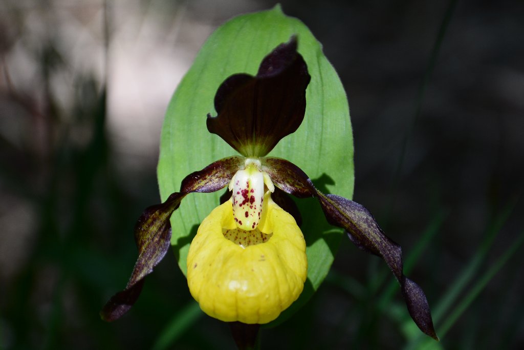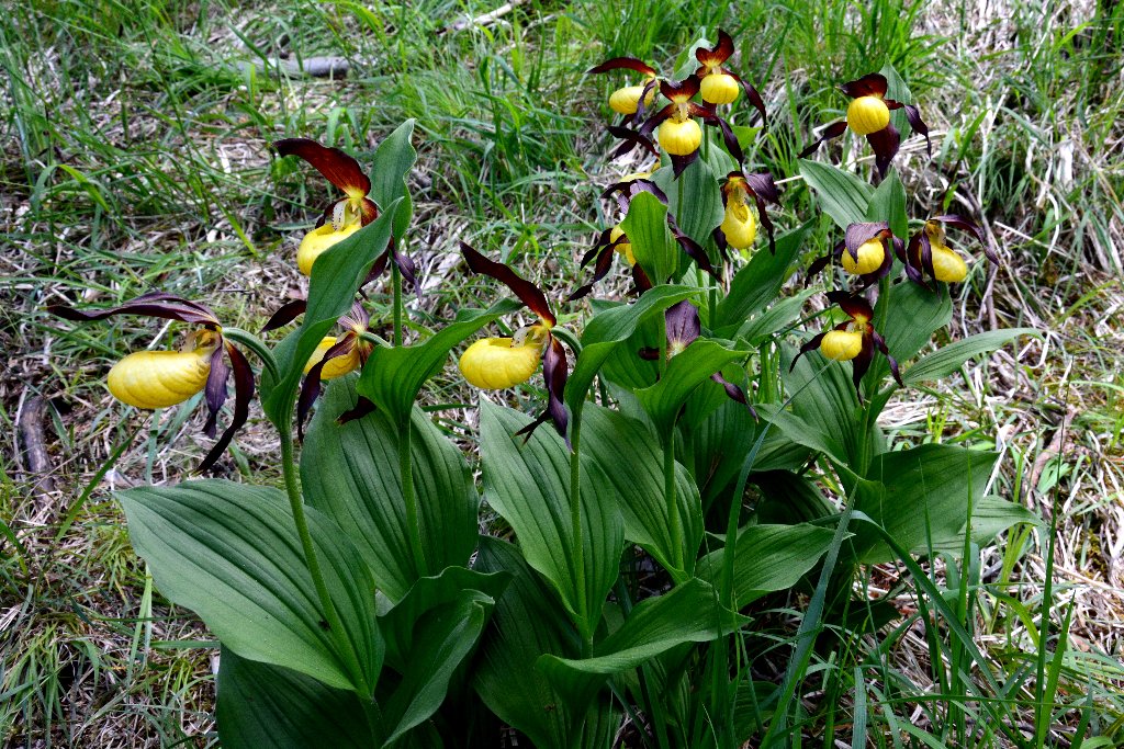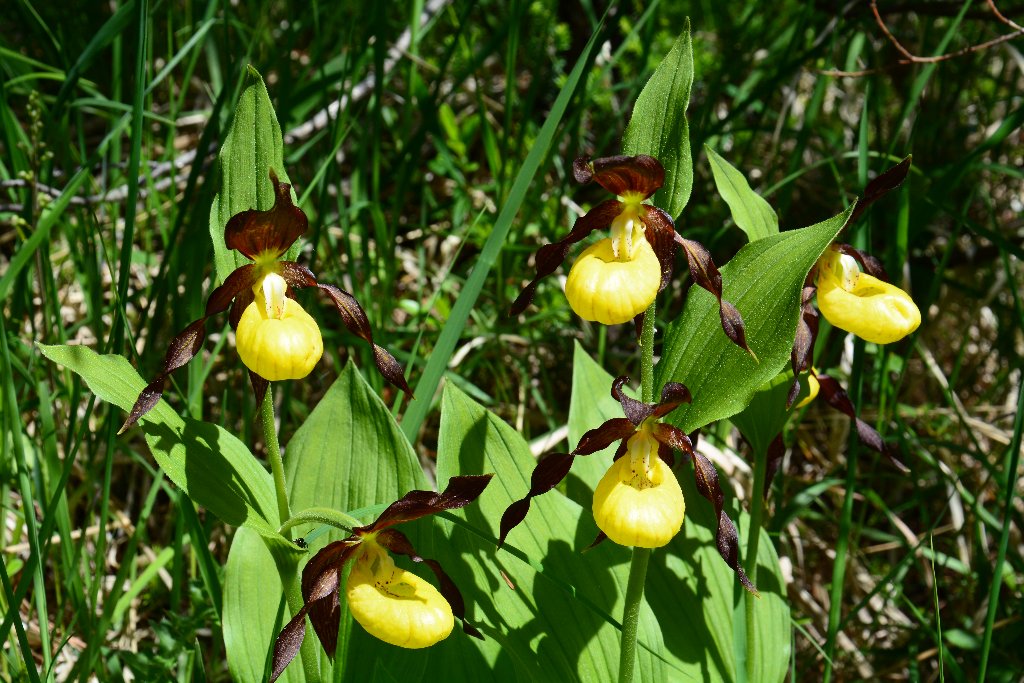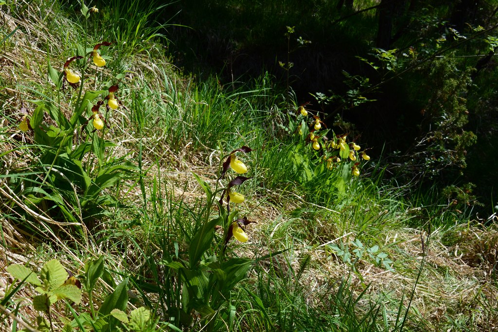 Noch haben wir kaum einen Frauenschuh gesehen! Das ändert sich aber je weiter wir durch den Wald hinaufsteigen. Immer wieder entdeckt jemand im dichten Waldgrün die auffallenden gelben „Schuhe“ einzeln oder meist in Büscheln.
