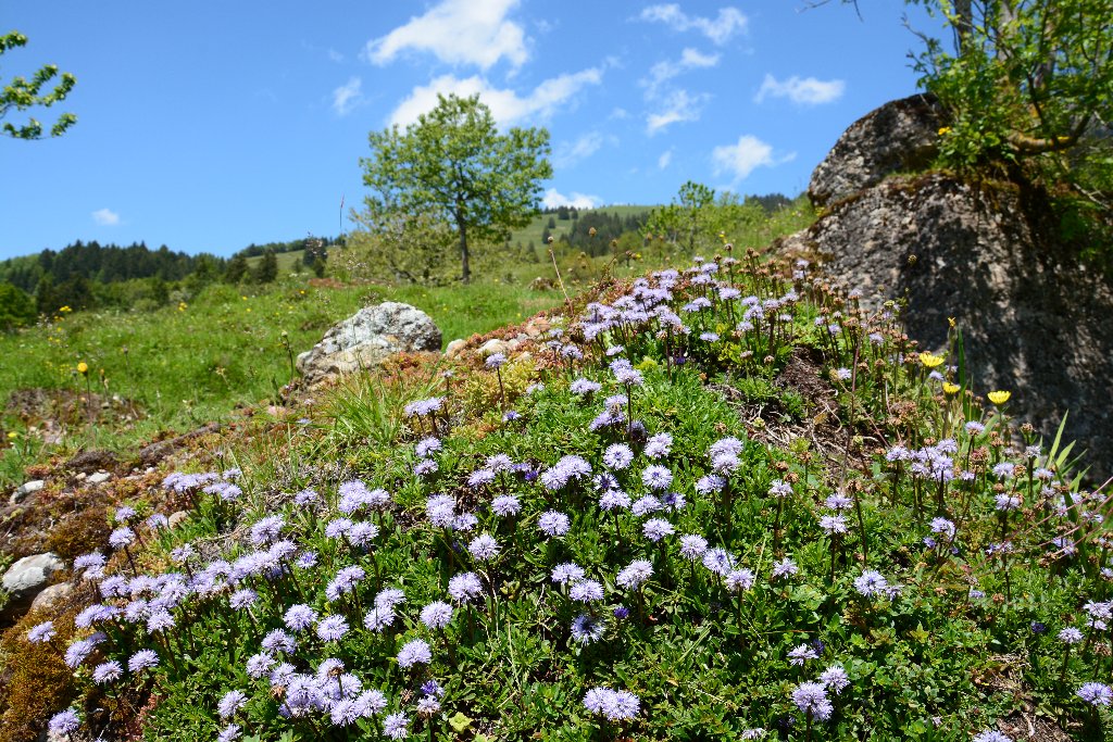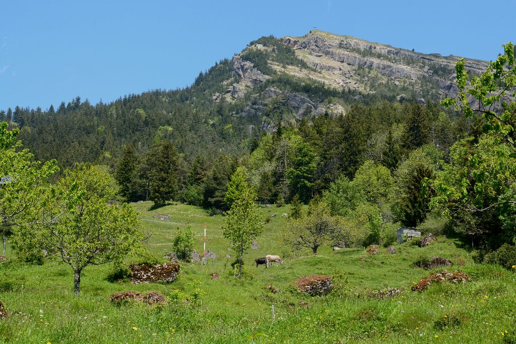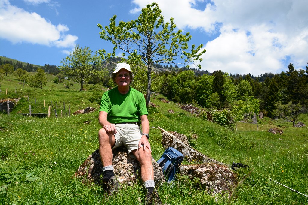 Wir gehen weiter auf dem Querweg durch den Wald nach Ober Spitzibühl 957m, wo wir auf einer mit Felsblöcken durchsetzten Wiese unter Bäumen unseren Mittagshalt halten. Dies ist ein wunderschöner, lauschiger Ort und wir geniessen den Sonnenschein und das Gebimmel der Kuhglocken.