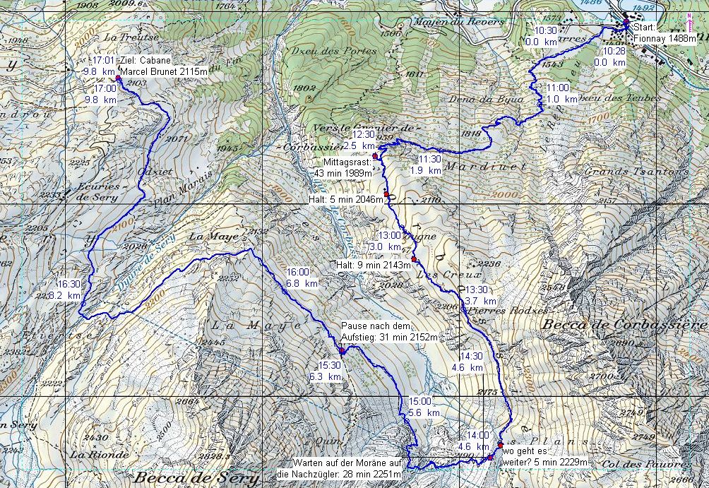 | 31.07. | Fionnay | Cab. Marcel Brunet | 6 h 33 min | 4 h 32 min | 9.8 km | 1022 m | 394 m |