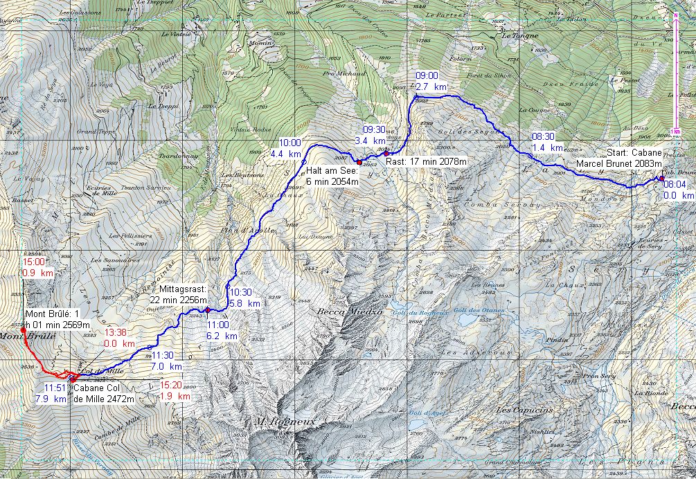 | 01.08. | Cab. Marcel Brunet | Cab. Col de Mille | 3 h 47 min | 3 h 02 min | 7.9 km | 640 m | 243 m |