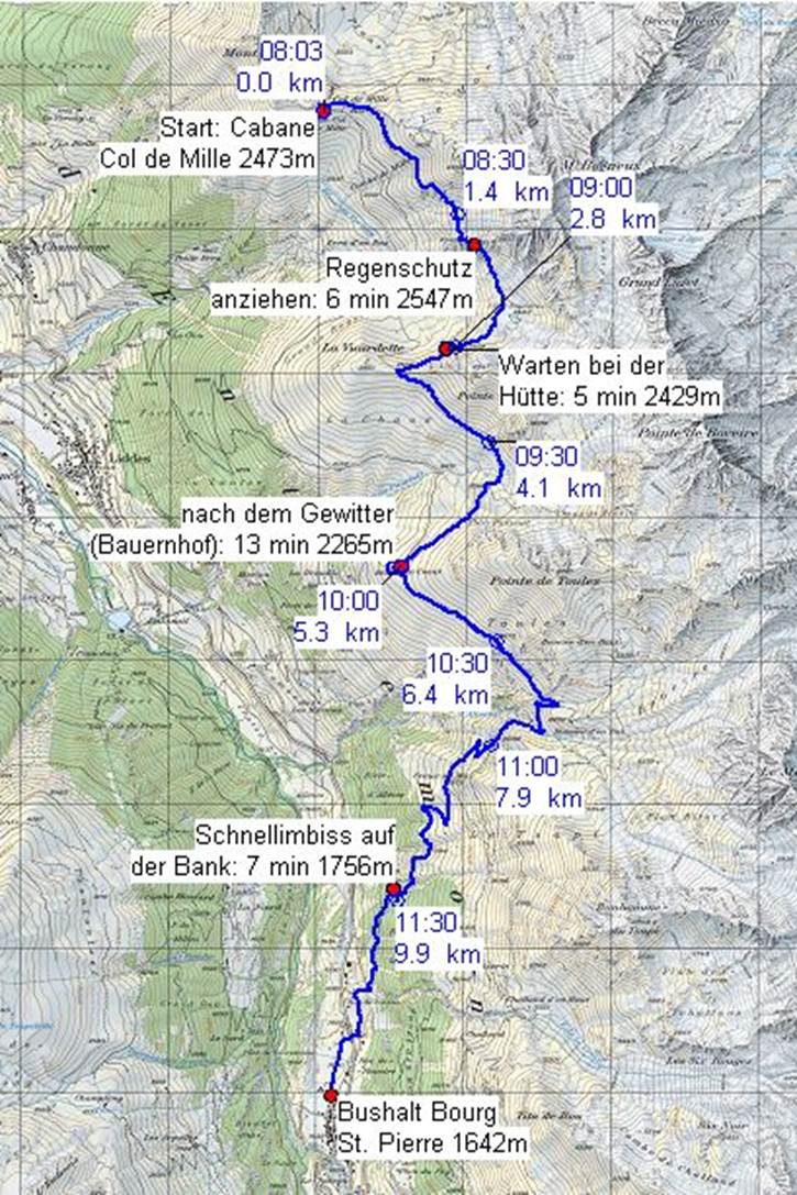 | 02.08. | Cab. Col de Mille | Bourg St. Pierre | 3 h 57 min | 3 h 26 min | 11.8 km | 205 m | 1036 m |