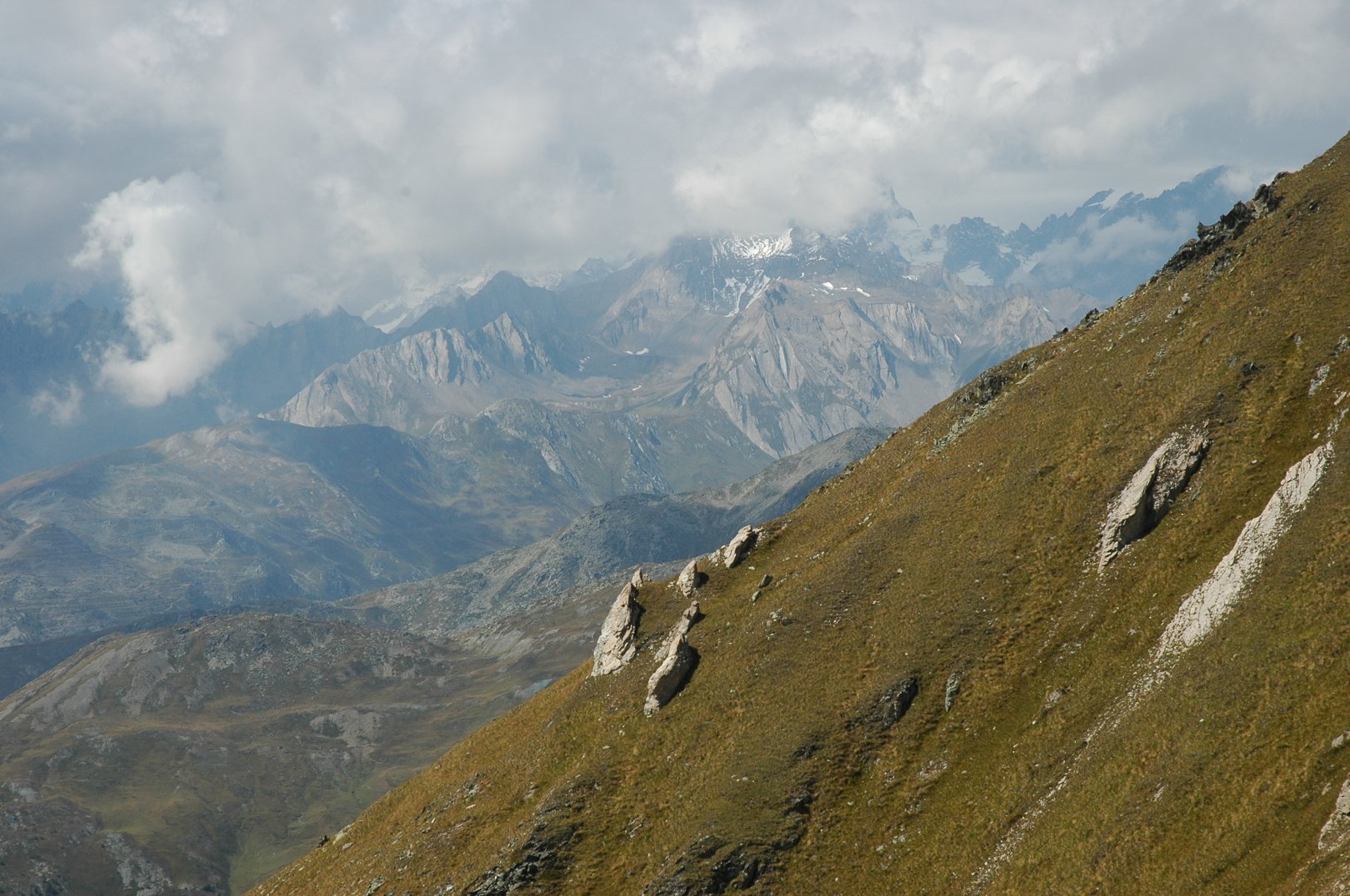 | Von da an ging’s rauf und runter und besonders in der letzten Stunde recht mühsam bis nach Bourg St.-Pierre, wo wir nach knapp vier Stunden um 13.50 Uhr eintrafen.Dort stellte sich heraus, dass der nächste Bus erst um 16.50 Uhr fahren würde und so bestellten wir aus Orsières einen Taxisbus, der uns in sausender Fahrt ins Tal fuhr.