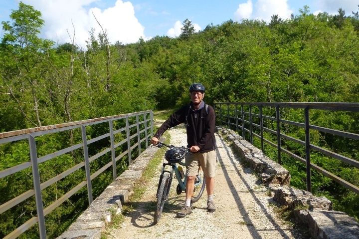 Ort Motovun: Rundfahrt, teils über die verlassene Bahnlinie „Parenzana“, sehr gut ausgebaut für Velos, wunderschöne Ausblicke ins Land, später Hinab und Hinauf auf den schlecht signalisierten Wald- und Feldwegen zurück nach Motovun. 6 Stunden unterwegs, „bisschen“ anstrengend!