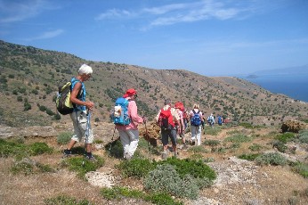 | Zurück am Hafen in Karaves gab es ein wunderbares Mittagessen auf der Terrasse, mit frittierten Calamari. Dann das gespannte Warten auf unser Schiff. Der Platz vor der Taverne füllte sich mit den kleinen Lieferwägen. Beim Löschen der Schiffsladung halfen einige unserer starken Männer fleissig mit, und so konnten wir bald die Überfahrt beginnen. In der Sonne war es heiss, im Schatten windig und kalt, aber überall holte sich das eigentlich sanfte Schaukeln des Schiffes seine Opfer. Da ich auch unter diesen war, weiss ich nicht viel von dieser Fahrt. Eines hab ich aber dazu gelernt: wie einem zu Mute ist, wenn man seekrank wird.Zurück in Paleochora hatte ich nur den einen Wunsch: Ruhe. Die Lebensgeister kehrten – wie unsere Stadtbummler – bald zurück und einige genossen einen kurzen Strandspaziergang oder einfach die Ruhe im Licht der sinkenden Sonne, bevor uns der Hotelier mit seinem Auto wieder nach Paleochora brachte. Nachdem wir Christine davon abhalten konnten, eine Ferienwohnung neben dem Polizeiposten zu erstehen, gings zum Abendessen in der Altstadt. An der langen Tafel wurde viel zu viel zum Essen bestellt, obwohl trotz der Probleme auf der Schifffahrt alle wieder gesunden Appetit zeigten. Mit einem Spaziergang zur beleuchteten Kirche und durch die belebten Gassen endete ein erlebnisreicher schöner Tag. Mechthild |