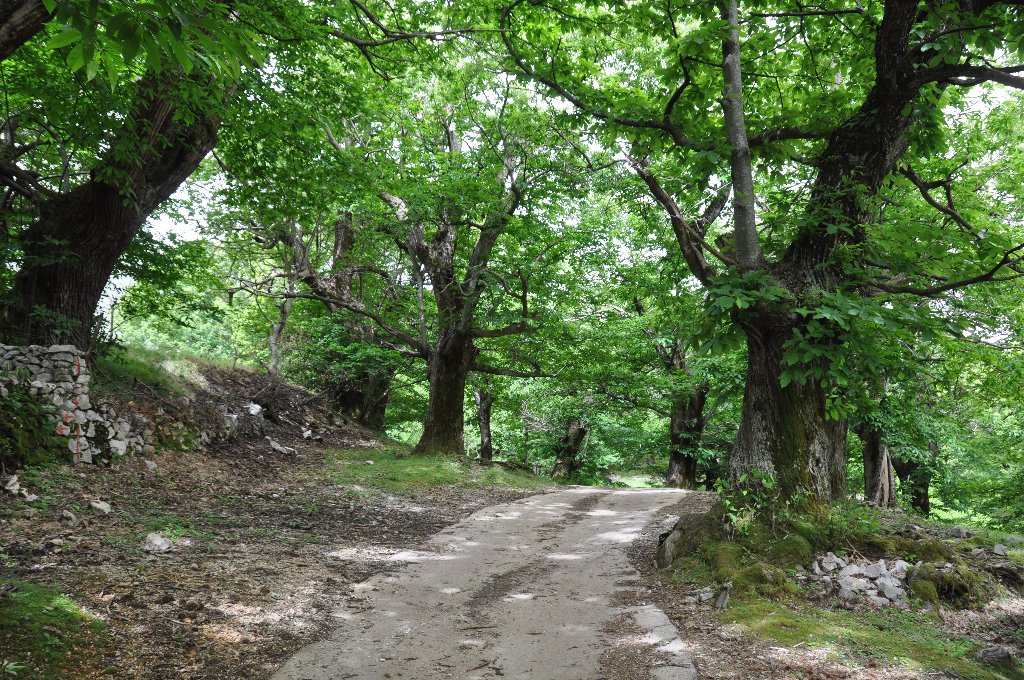 | Nahe dem höchsten Punkt der Insel (382 m) bei Vardia, wo wir durch grössere Kiefernwälder fuhren, umschloss ein Gitterzaun ein Waldstück, in dem drei Mobiltelefongesellschaften ihre Antennen errichtet haben.Der Bus bringt uns bis Ambelos, einen Ort, der fast nur aus verfallenen Steinhäusern besteht, mitten drin aber ein weiss getünchtes Kirchlein. Vor dem offenbar einzigen bewohnbaren Haus macht sich eine Frau zu schaffen. |