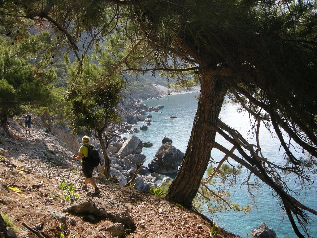 Auf einem steilen, sehr gut unterhaltenen und markiertem Wanderweg erreichten wir nach etwas mehr als einer Stunde den Dorfeingang von Komiza, wo uns der Bus bereits erwartete. Kurz zuvor hatten wir drei Bootsbauer angetroffen, die an einer Replica eines antiken Fischerbootes arbeiteten, welches vor 2000 Jahren in dieser Gegend verwendet worden war. Damit wollen die Drei im Juli an einer Regatta teilnehmen. |