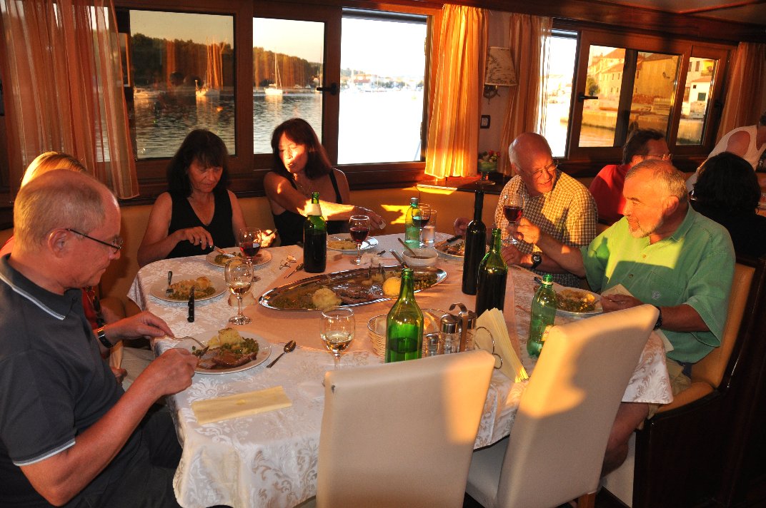 19.30 Captains Dinner: Arsen, unser Kapitän, begrüsst uns. als Apéritiv eine Art Nocino (Prosek). Wir stossen an: “zivili” = Prosit (schiwili ausgesprochen). |