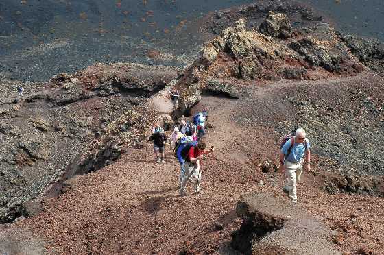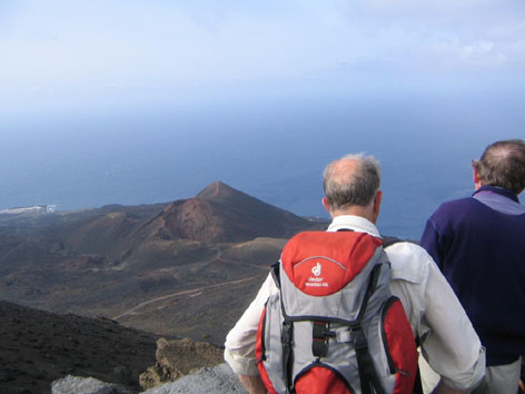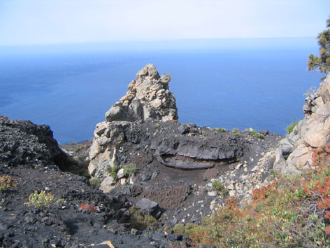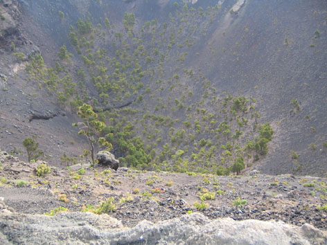 Zum Abschluss der Besichtigung konnten wir in einem kurzen Film den Ausbruch des Teneguia von 1971 miterleben.Damit war unsere Phantasie genügend angeregt, um uns auf der nun folgenden Wanderung zu den Vulkanen das Treiben dieser Teufelsküche lebhaft vorzustellen.Zuerst marschierten wir auf den Vulkan San Antonio, der als Bilderbuchvulkan gilt, weil er einen vollendet runden Aschenkegel bildet. Vom Kraterrand (nur die Hälfte darf beschritten werden) ist der Blick in den zentralen Kessel frei, auf dessen Grund ein kleiner Bestand von Pinus canariensis gedeiht. |