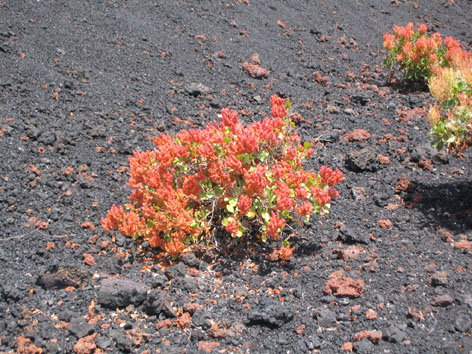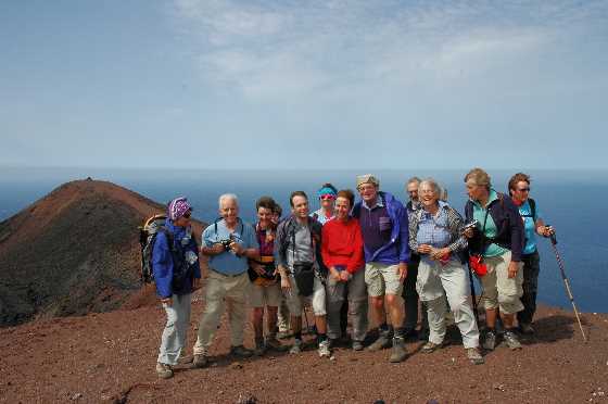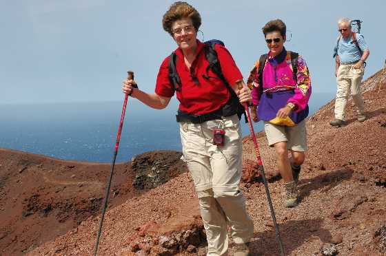 Mühsam für uns war beim Besteigen des Teneguia das Gehen bei dem böig starken Wind, der nicht nur leer gegessene Plastiksäcke sondern manchem auch die Aufstiegslust wegblies. Bert hatte Glück: ihm blies der Wind nur durch ein Nasenloch hinein, durchs andere raus, was aber die Bezwingung des Grates und Gipfels nicht behinderte. Eher das Photographieren!Der Abstieg erfolgte zuerst durch scharfkantige Lava, dann aber genussvoll über weite Aschenhänge mit spärlichem Spriessen von fast leuchtend orangerotem Ampfer. A propos leuchtend orangerot: je mehr sich unsere hellen Wanderhosen der (schwarzen) Aschenfarbe anglichen, desto bunter wurden die übrigen Modeaccessoires wie Sonnenbrillen usw. Wir erreichten den Faro de Fuencaliente, bewunderten den alten und den neuen Leuchtturm und darunter die idyllisch verlassene Playa del Faro. Für ein Bad im Meer war die Temperatur nicht ausreichend, für den Besuch der berühmten Salinen offenbar die Zeit nicht. So bestiegen wir unseren Bus, der uns auf der Küstenstrasse zum späten Mittagessen zur Playa de Zamora brachte, vorbei an der modernen Hotelanlage von La Palma Princess und Teneguia Princess, deren für uns wenig einladende Poollandschaft wir später von der höher gelegenen Strasse bei Las Indias noch bewundern konnten. |