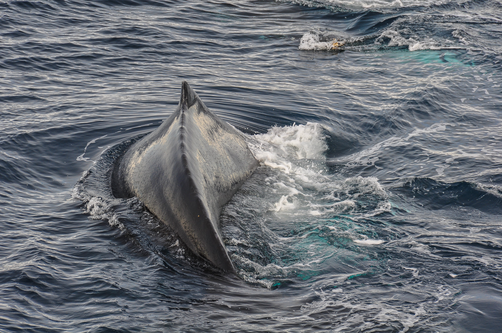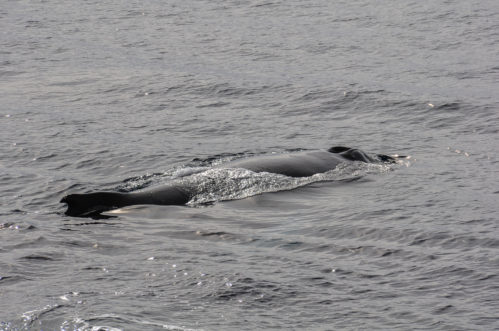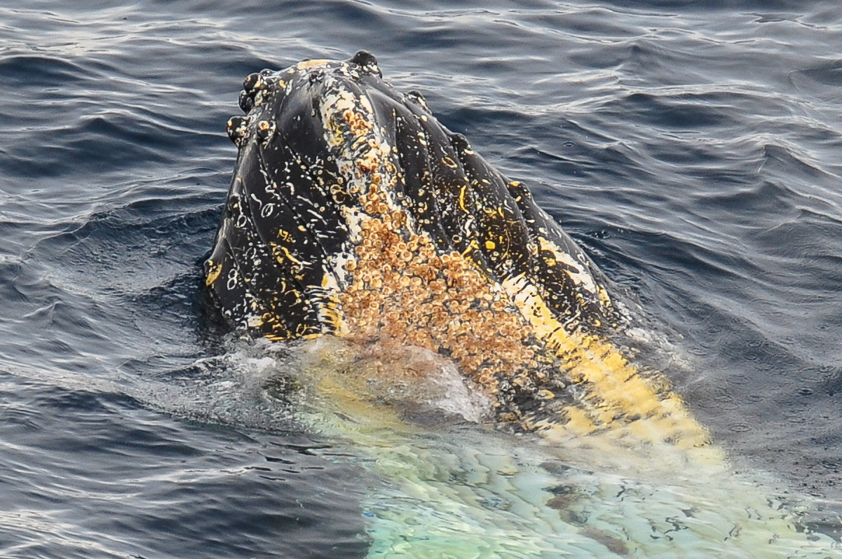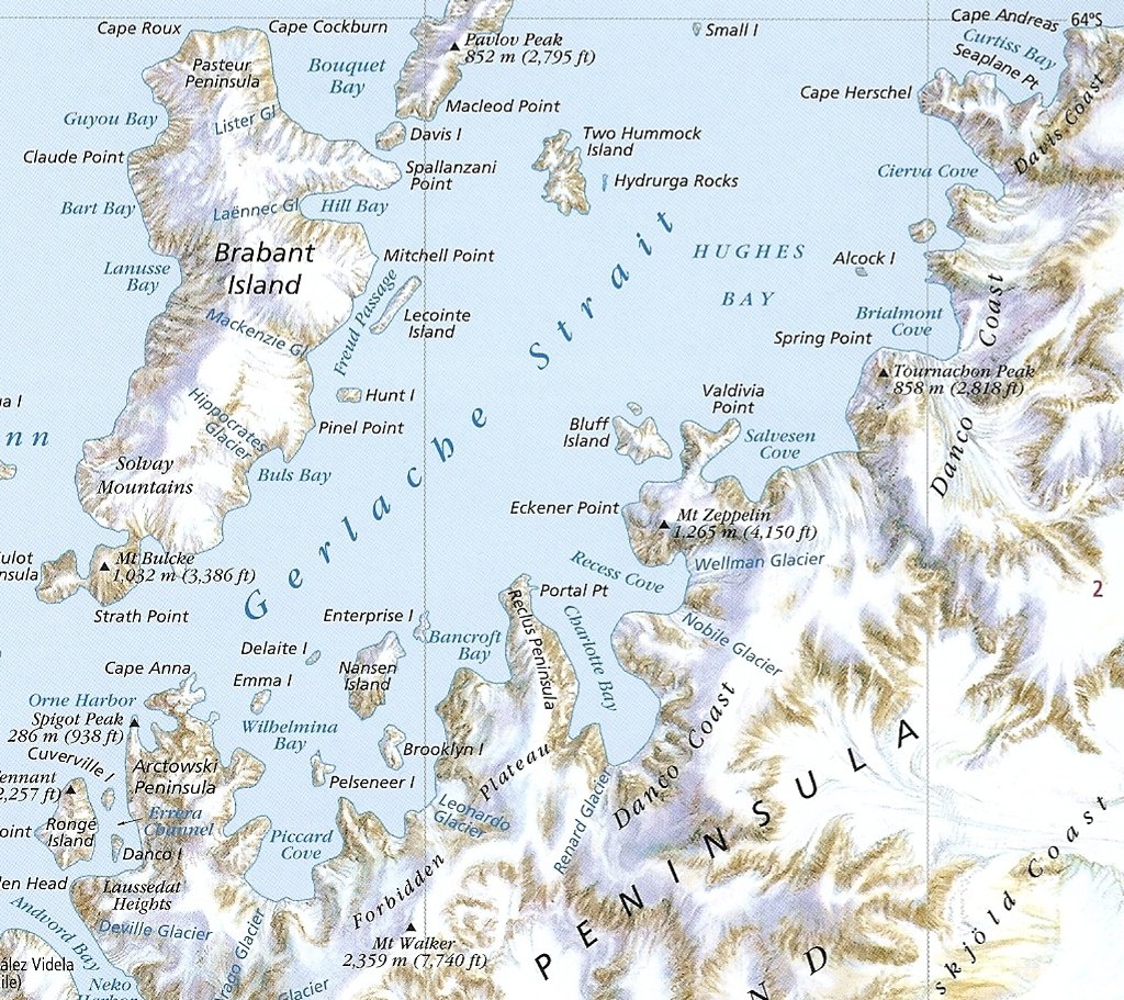 Soon after we left the sheltered cove the weather cleared and became quite sunny over the waters of the Gerlache Strait, down which we were heading South to our next destination near Spigot Peak and Orne Harbour. Here Humpback whales were spotted and the ship actually turned round and stopped in order to be able to watch them as long as possible. A group was feeding on the krill and one picture I took shows the underside of the jaw of a whale, normally not visible. Otherwise the lighter coloured areas under the water are usually the fins. The whale watching is most exciting when a whale dives lifting the fluke in the air before it disappears.