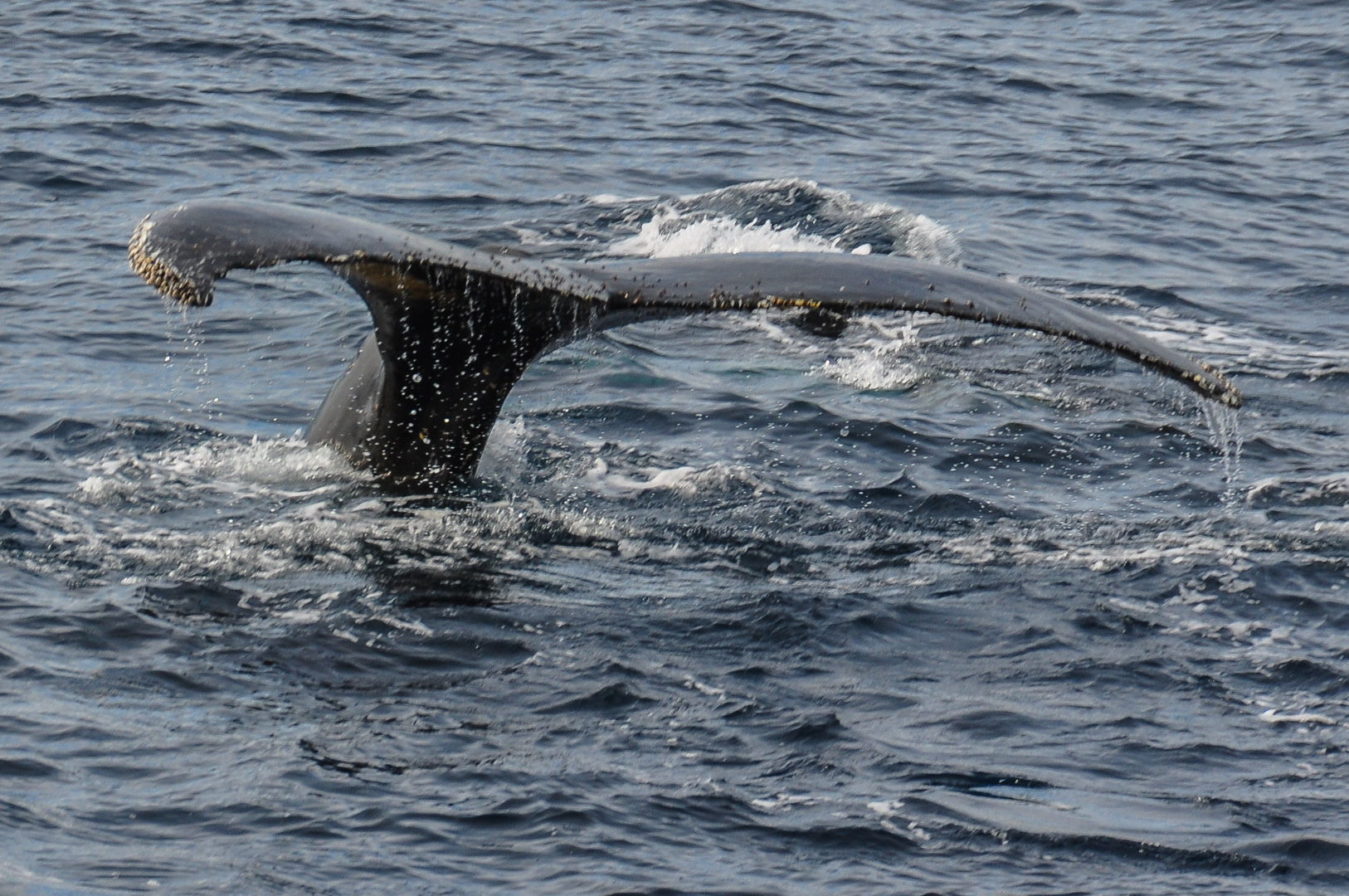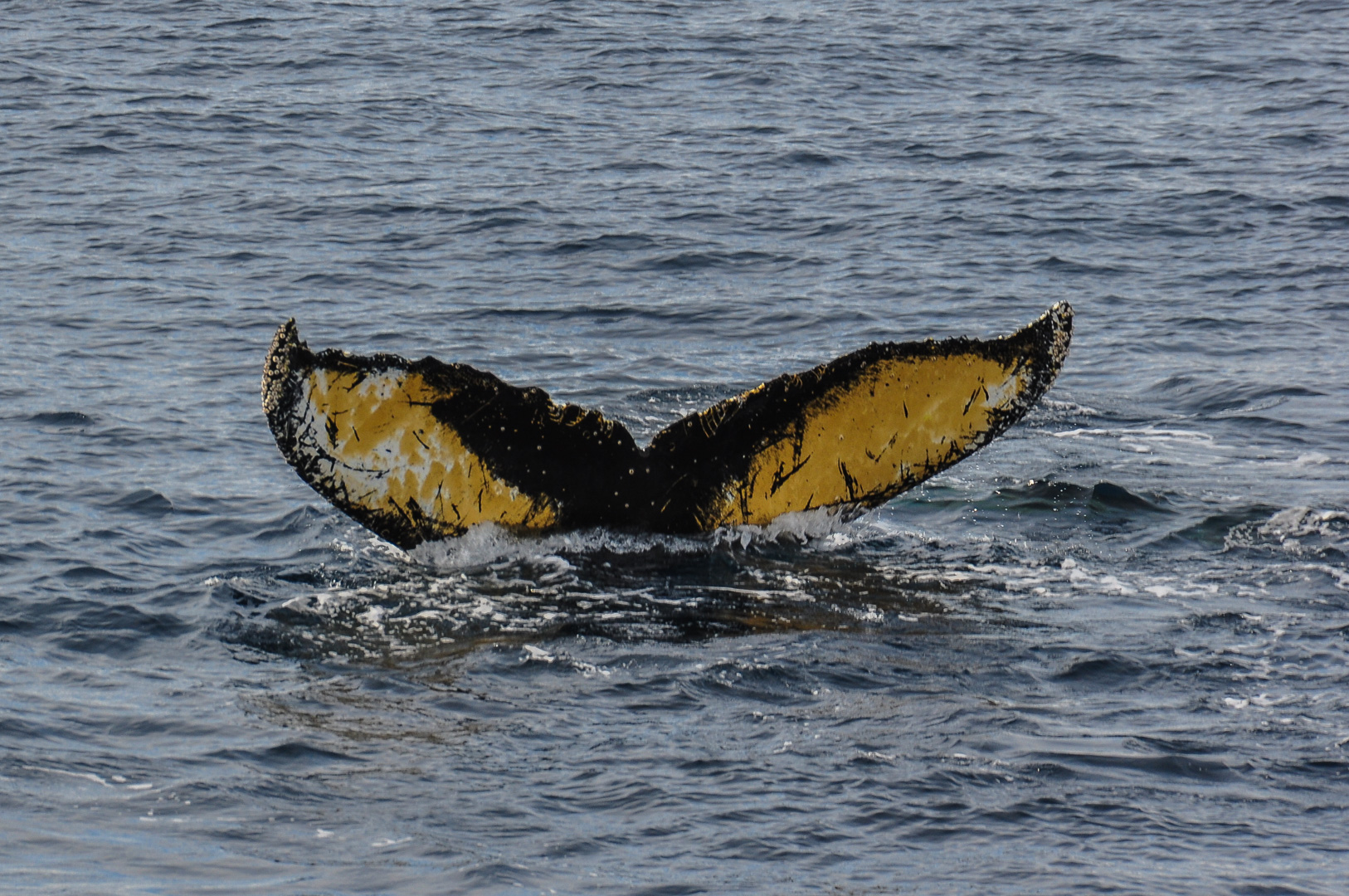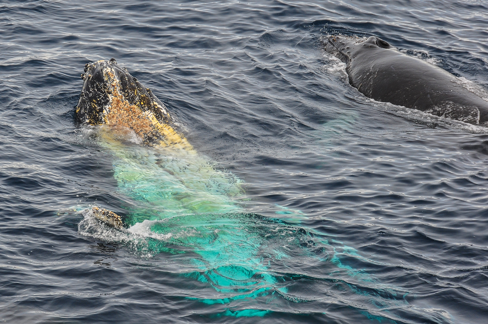 Soon after we left the sheltered cove the weather cleared and became quite sunny over the waters of the Gerlache Strait, down which we were heading South to our next destination near Spigot Peak and Orne Harbour. Here Humpback whales were spotted and the ship actually turned round and stopped in order to be able to watch them as long as possible. A group was feeding on the krill and one picture I took shows the underside of the jaw of a whale, normally not visible. Otherwise the lighter coloured areas under the water are usually the fins. The whale watching is most exciting when a whale dives lifting the fluke in the air before it disappears.