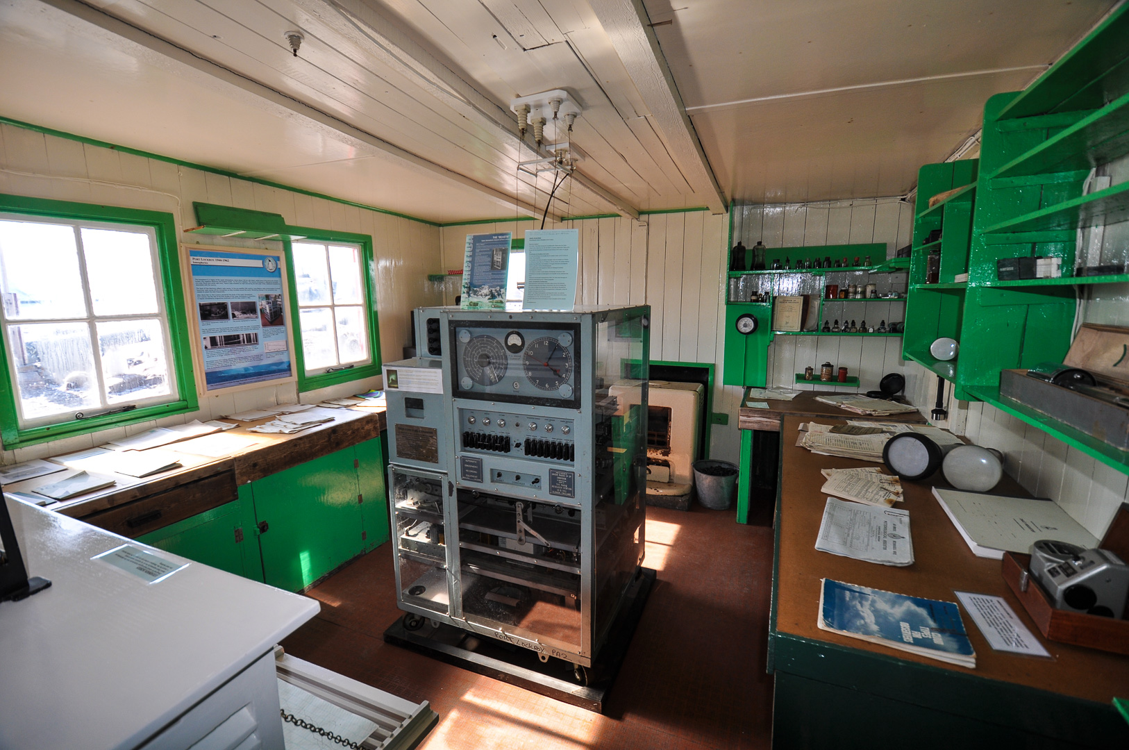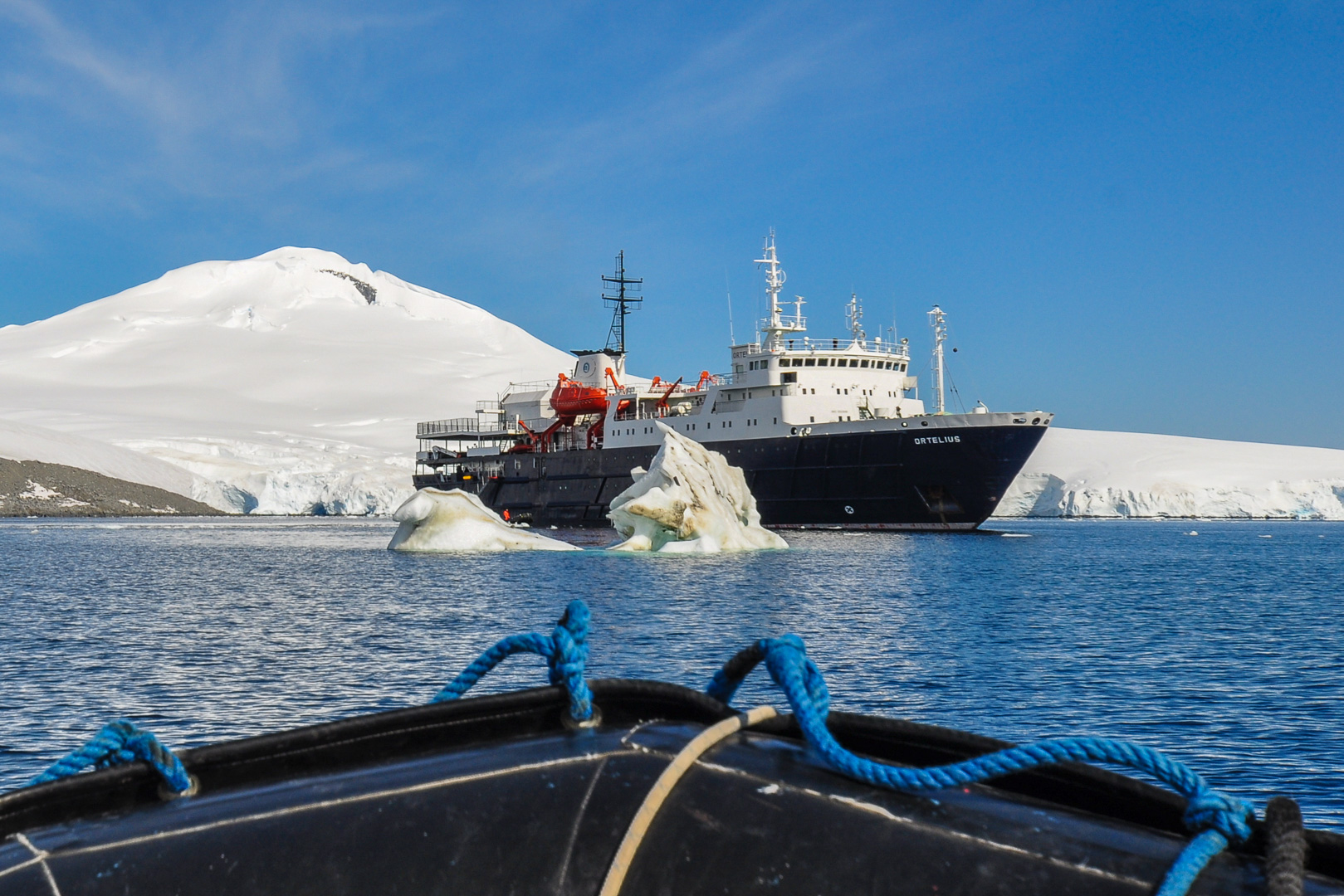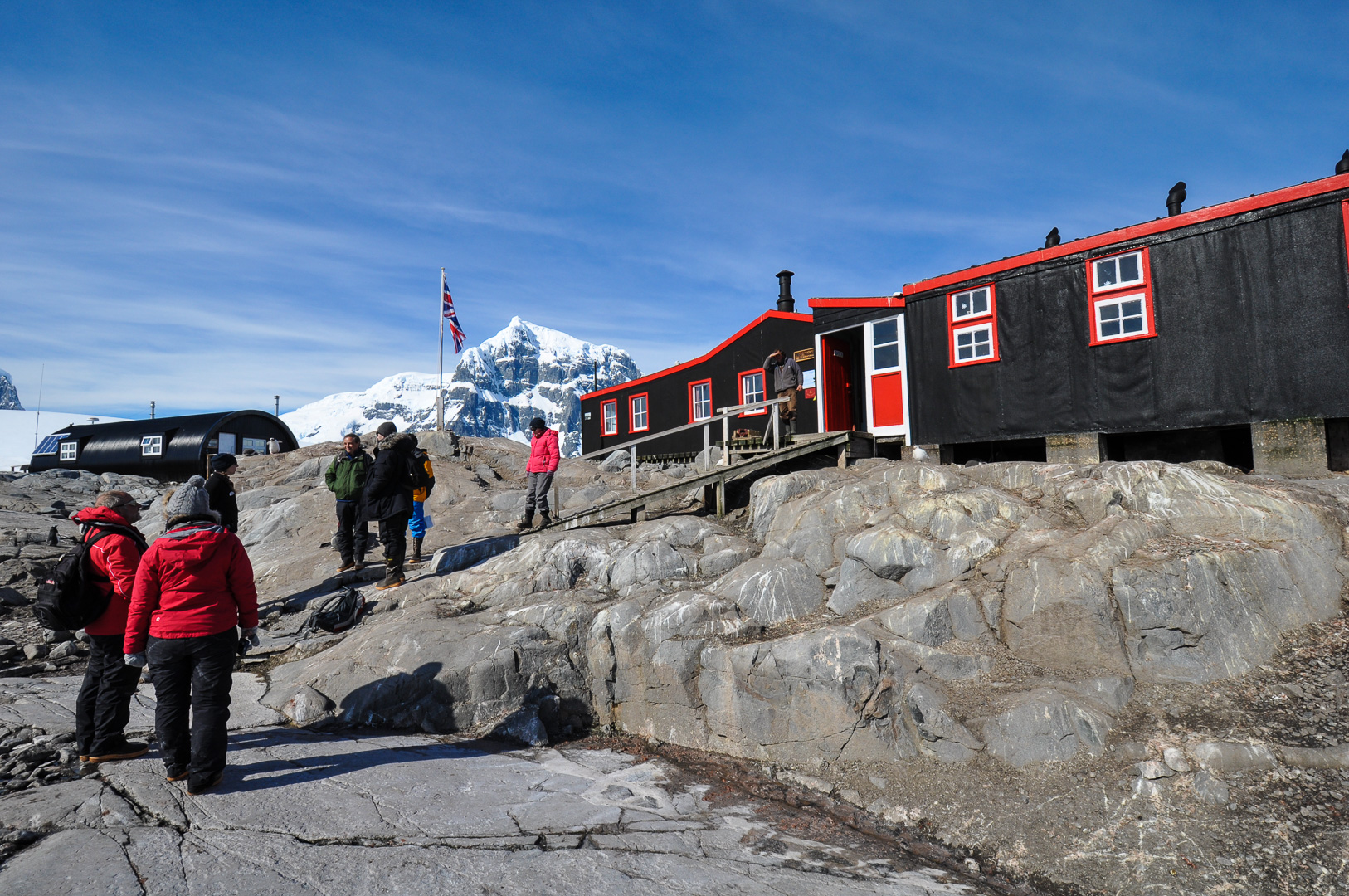 The morning landing was to be at Port Lockroy at the Southern end of Goudier Island near Doumer Island on the other side of the Neumayer Channel from the large Anvers Island. It is a historic site and part of the main hut has been preserved in its original state as a museum. On the opposite side of the natural harbor there was a colony of Gentoo penguins, which provided us great amusement. I show a few of the funny penguin pictures, but one really needs to see a whole sequence to understand what is going on. Here a perhaps a parent penguin was trying to help its chick over a lump of ice in a puddle, but they may both have been young ones. I suppose that I should have tried taking a short film. It was also interesting to see a complete whale skeleton lying on the beach. Only standing next to it does one get a true appreciation of its enormous size.