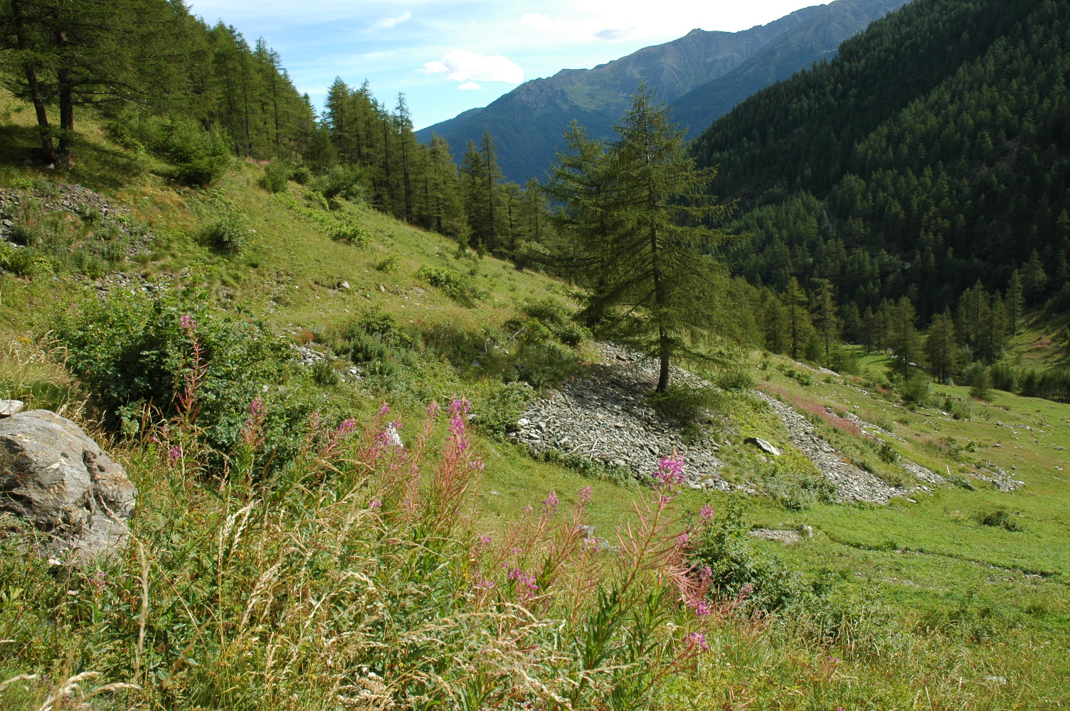 This itinerary offers, as well as superb examples of natural alpine architecture (including the elegant pyramid of the Matterhorn), matchless specimens of rural architecture that are inextricably linked with the life of the alpine pasturelands, such as the traditional Walser buildings in the Gressoney Valley and the upper reaches of the Ayas Valley. The route leads from Donnas to Courmayeur, with 17 daily stages that require 4–6 hours walking time, offering stopping points for all needs: camping sites, huts, refuges, hotels and hostels. The routes descend into the valley at the end of some stage, where it is possible to use the services provided by each of the villages or interrupt your journey and return to the central by valley bus. Theroute can be walked in the summer months and crosses medium and high altitude mountain areas, through meadows and pasturelands, woodlands and rocky outcrops, maintaining an average altitude of around 2,000 m. and often touching almost 3,000 m (on Col di Vesonna the route reaches 2,783 m.).